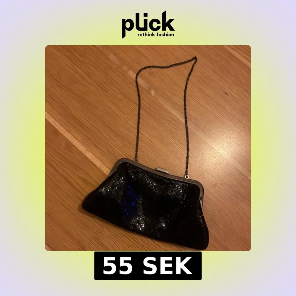 Snygg svart kuvertväska med glittrande yta och en smal kedjerem. Perfekt för en kväll ute eller en fest. Väskan har en metallram och ett enkelt lås upptill.