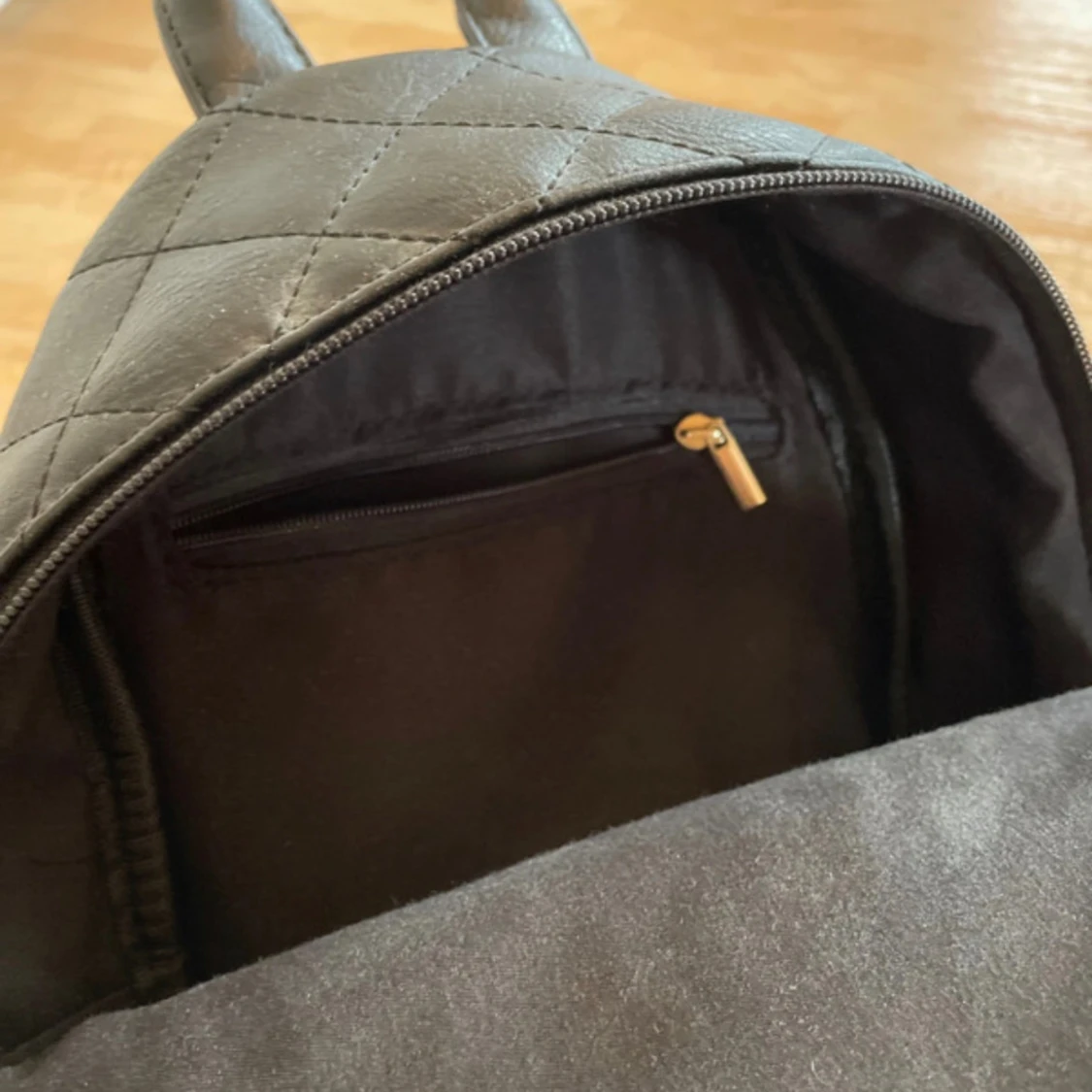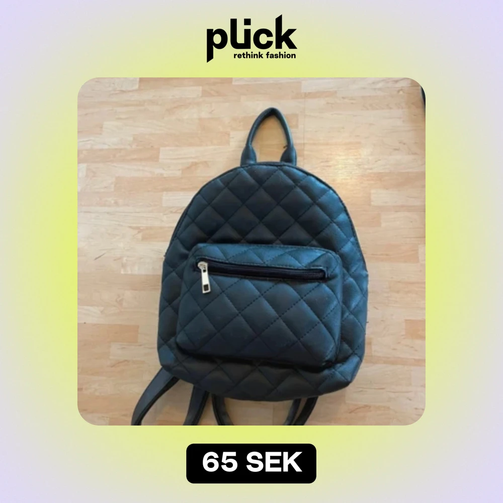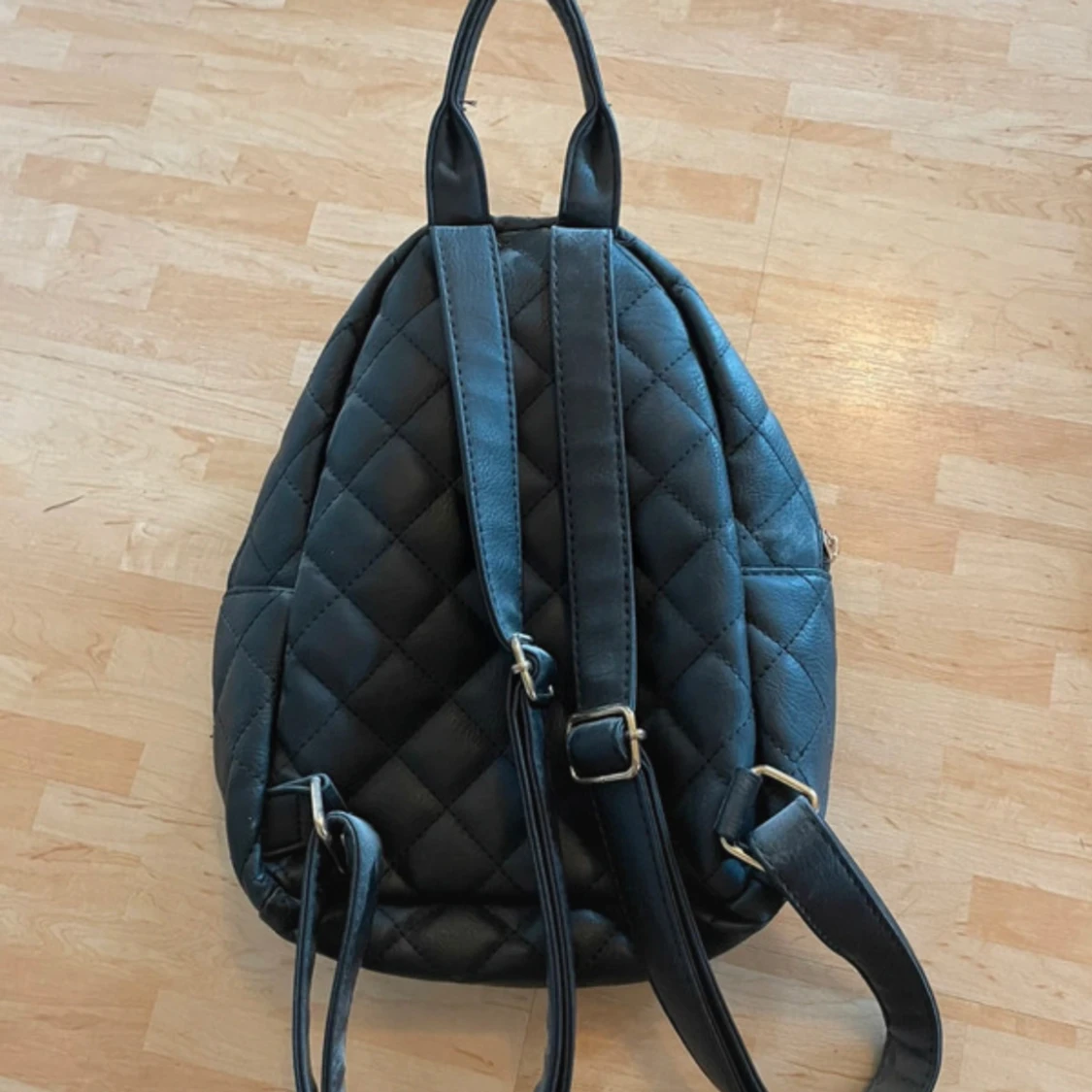 En svart liten ryggsäck använd bara ett par gånger. Den är 30 cm hög och cirka 25 cm som bredast. Väskan har guld färgade spännen och även en liten fick inuti.