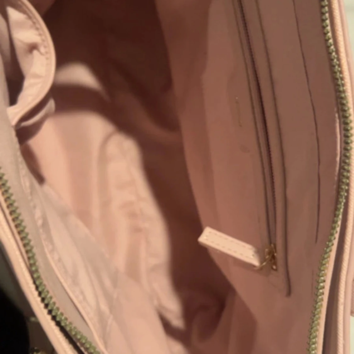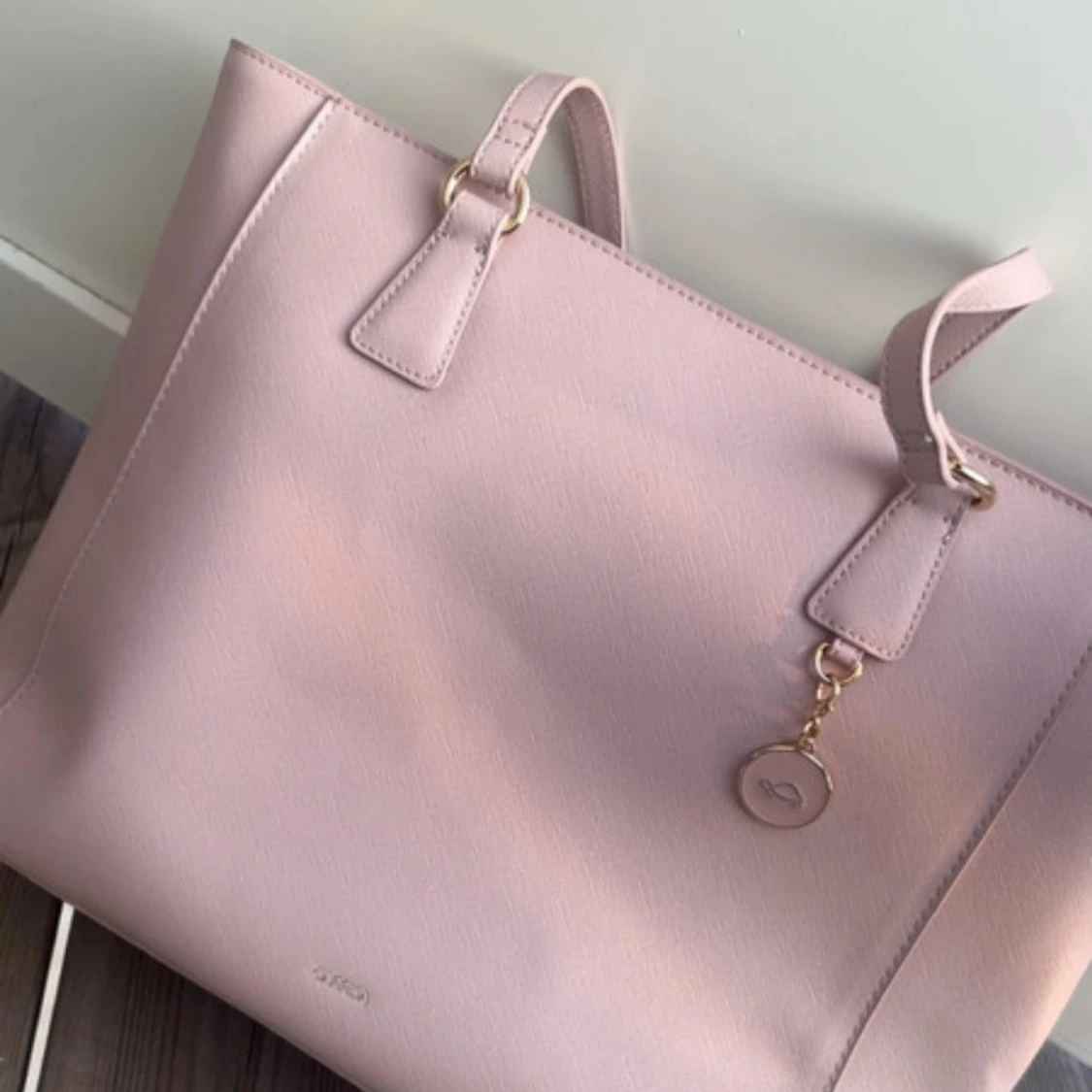 Säljer en stilren ljusrosa axelväska från Adax i syntetmaterial. Väskan har guldiga metalldetaljer, en dekorativ berlock och dragkedja upptill. Invändigt finns flera fack och en innerficka med dragkedja. Perfekt för dig som vill ha en snygg och rymlig väska.