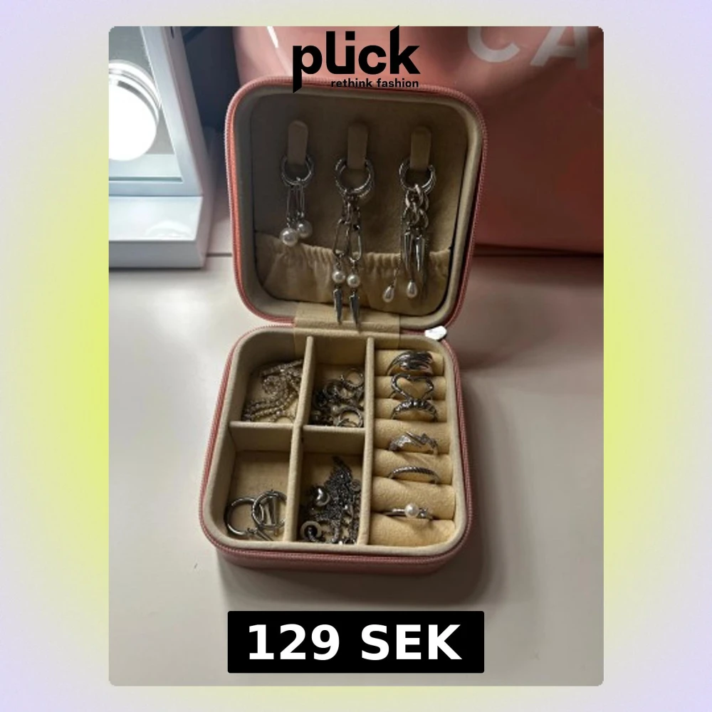 Snyggt smyckesskrin i ljusrosa med dragkedja. Perfekt för att organisera ringar, örhängen och halsband. Enkel att ta med på resa och smyckena slipper trassla ihop sig! Om ni är intresserade av att köpa några ringar, skriv till mig (typ alla är till salu)
