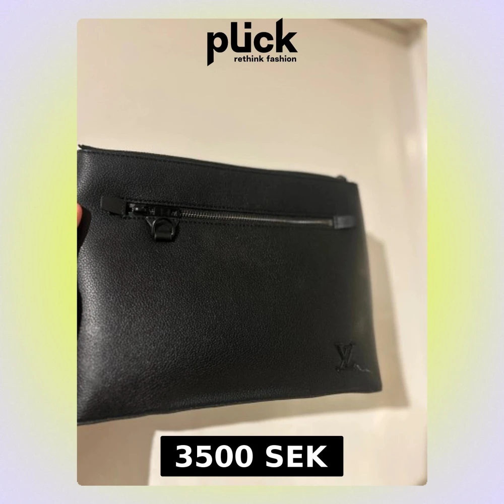 Stilren svart kuvertväska från Louis Vuitton i exklusivt skinn. Väskan har en diskret LV-logga i hörnet och en praktisk dragkedja framtill. Perfekt för dig som vill ha en clean och lyxig accessoar med plats för det viktigaste.