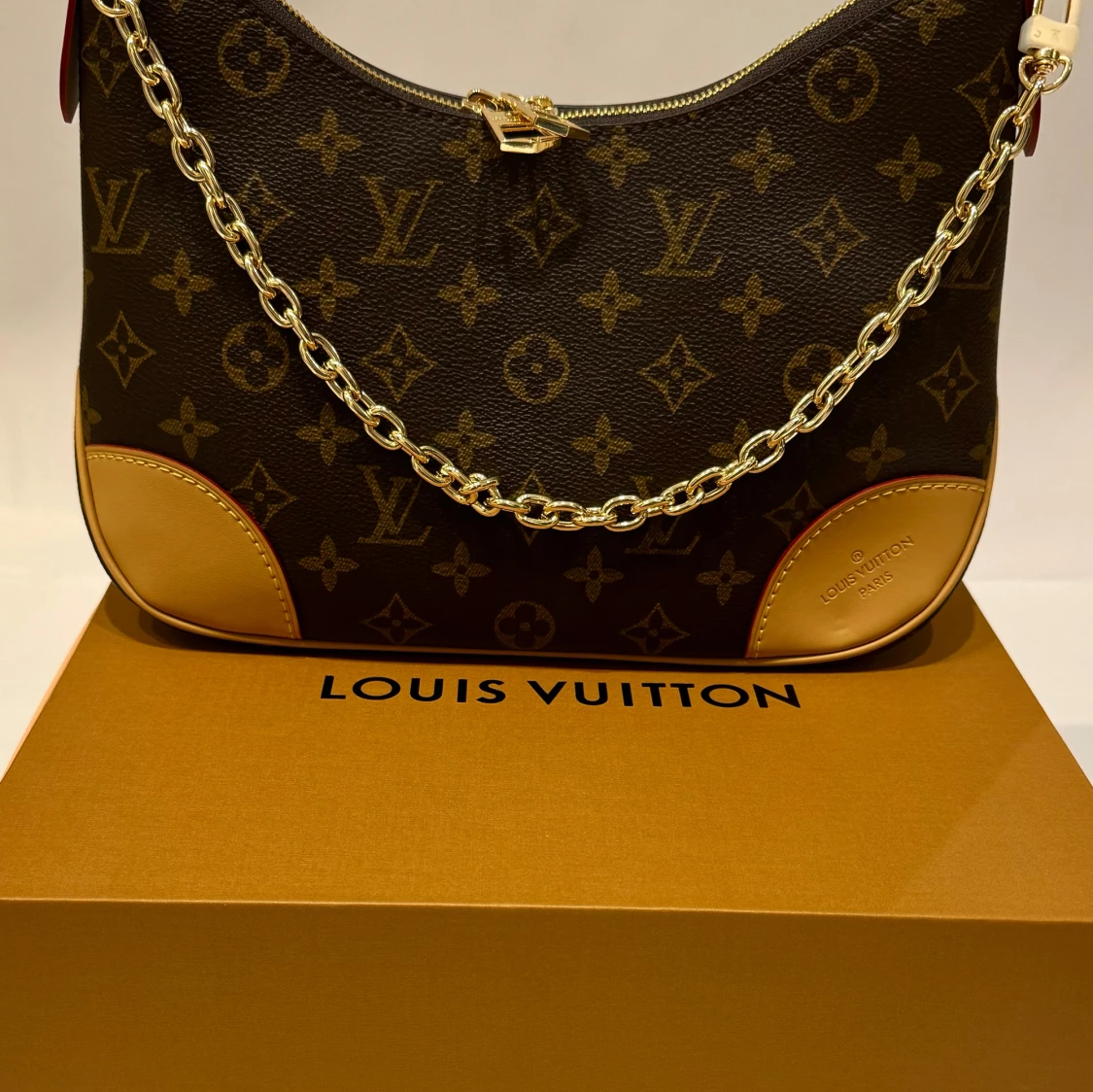 Snygg axelväska från Louis Vuitton med klassiskt monogrammönster i brunt och beige. Väskan har guldfärgad kedja och detaljer i ljust skinn. Perfekt för dig som vill ha en ikonisk och trendig accessoar med lyxig känsla.