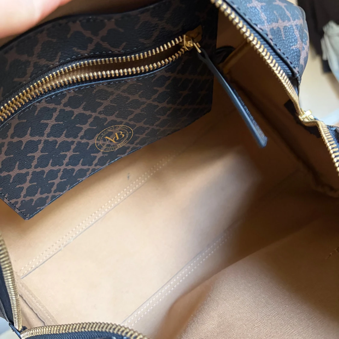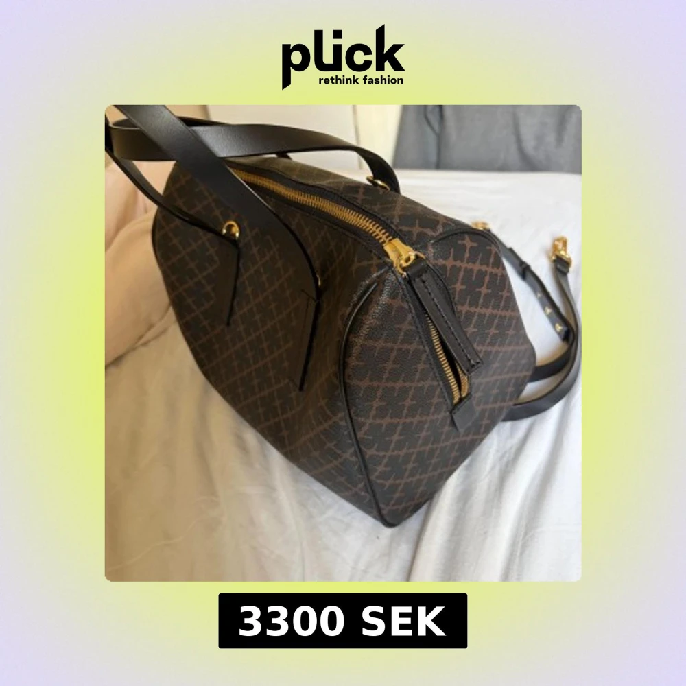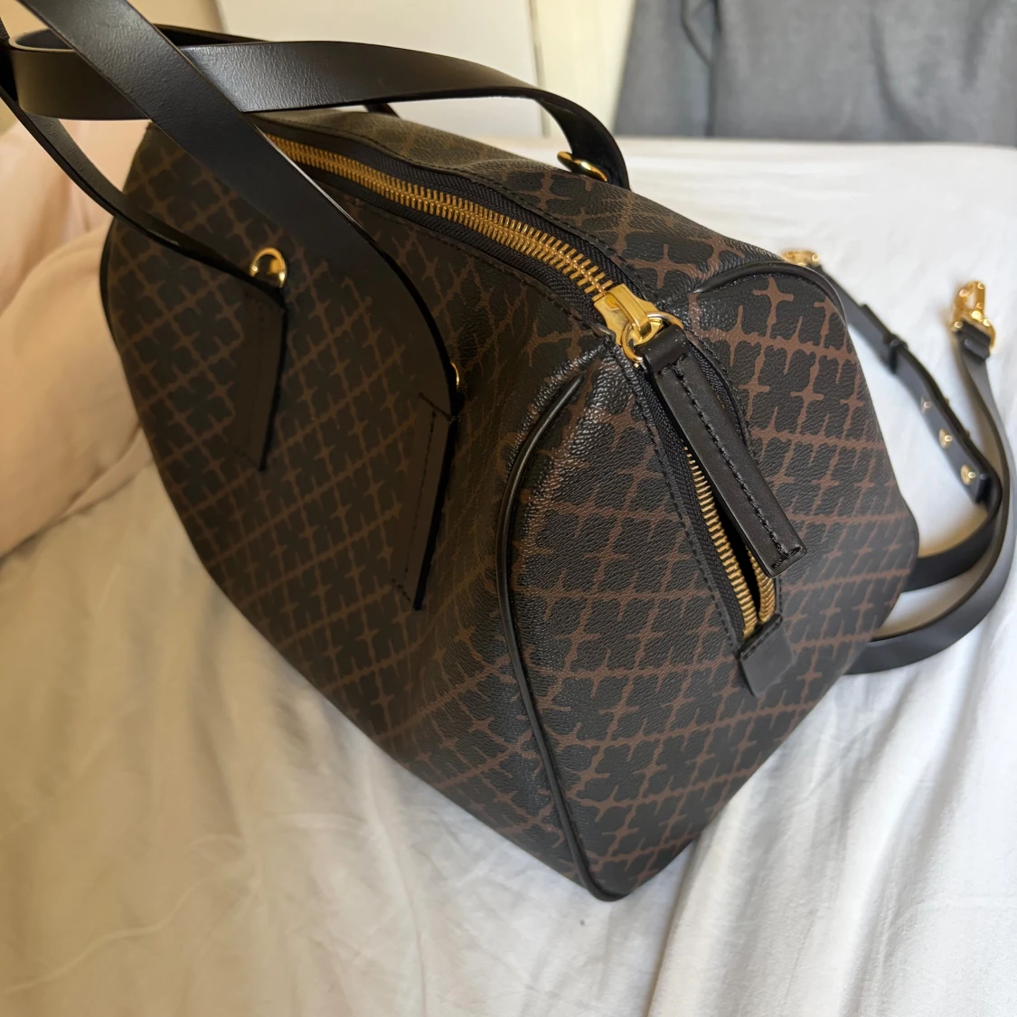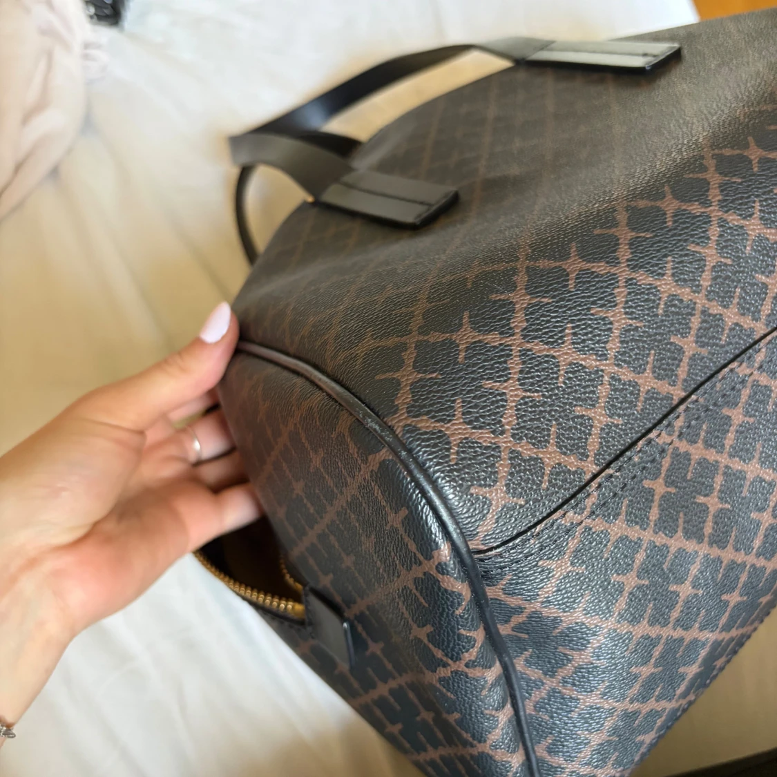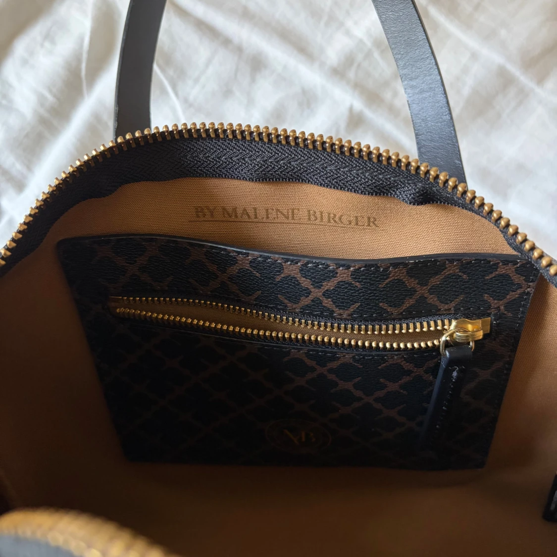 Snygg handväska från By Malene Birger i brunt och svart med ikoniskt grafiskt mönster.Väskan är i fint skick knappt använd. Väskan finns inte att köpa ny. Alla tryckta stämplar/ loggor är intakta och inget slitage, se bild. Original axelband förnöjer med, samt original innefickan som är avtagbar. De finns små skrapmärken undertill som knappt syns i verkligheten, se bild. Även en liten fläck i, inget som direkt syns heller se bild. Vid frågor, tveka inte på att skriv🩷