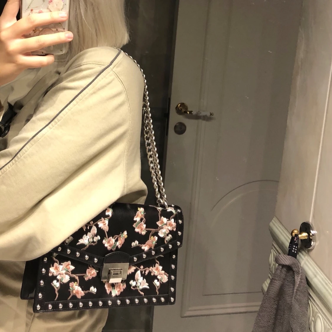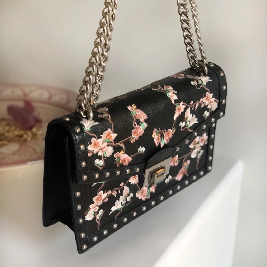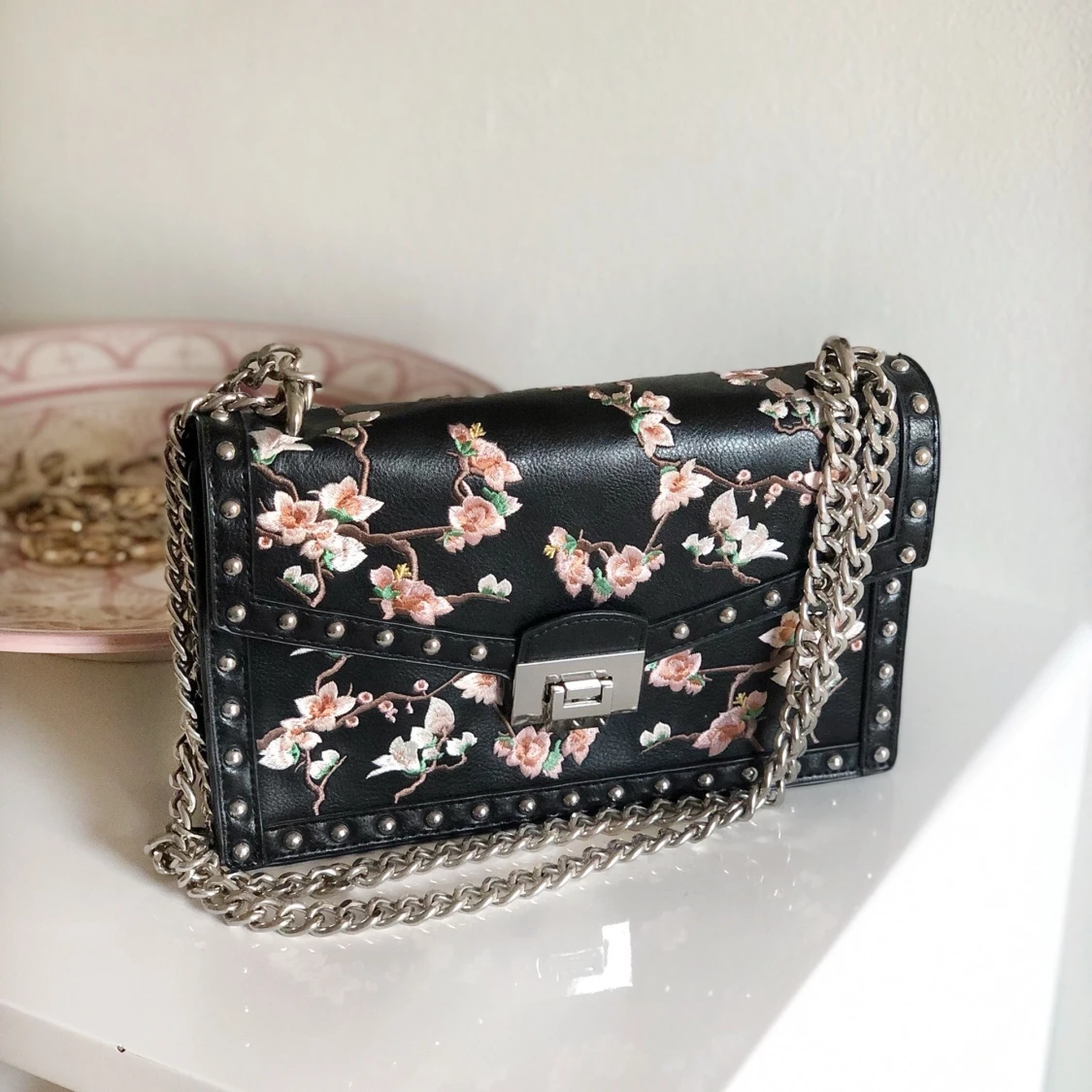 Axelväska med silver- och broderade detaljer. I nyskick och med reglerbart band.