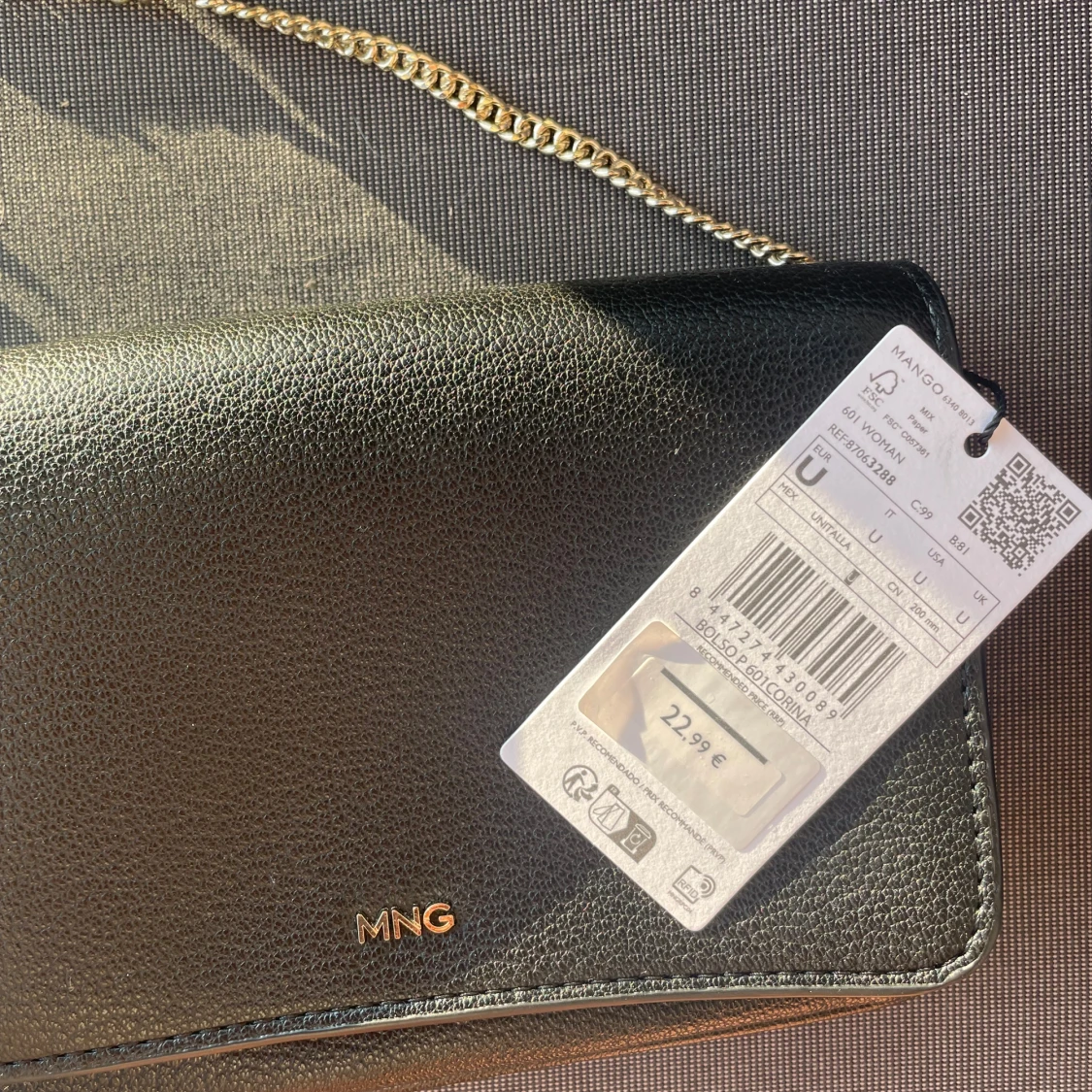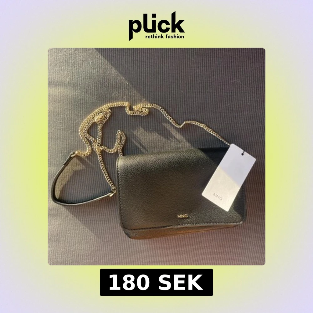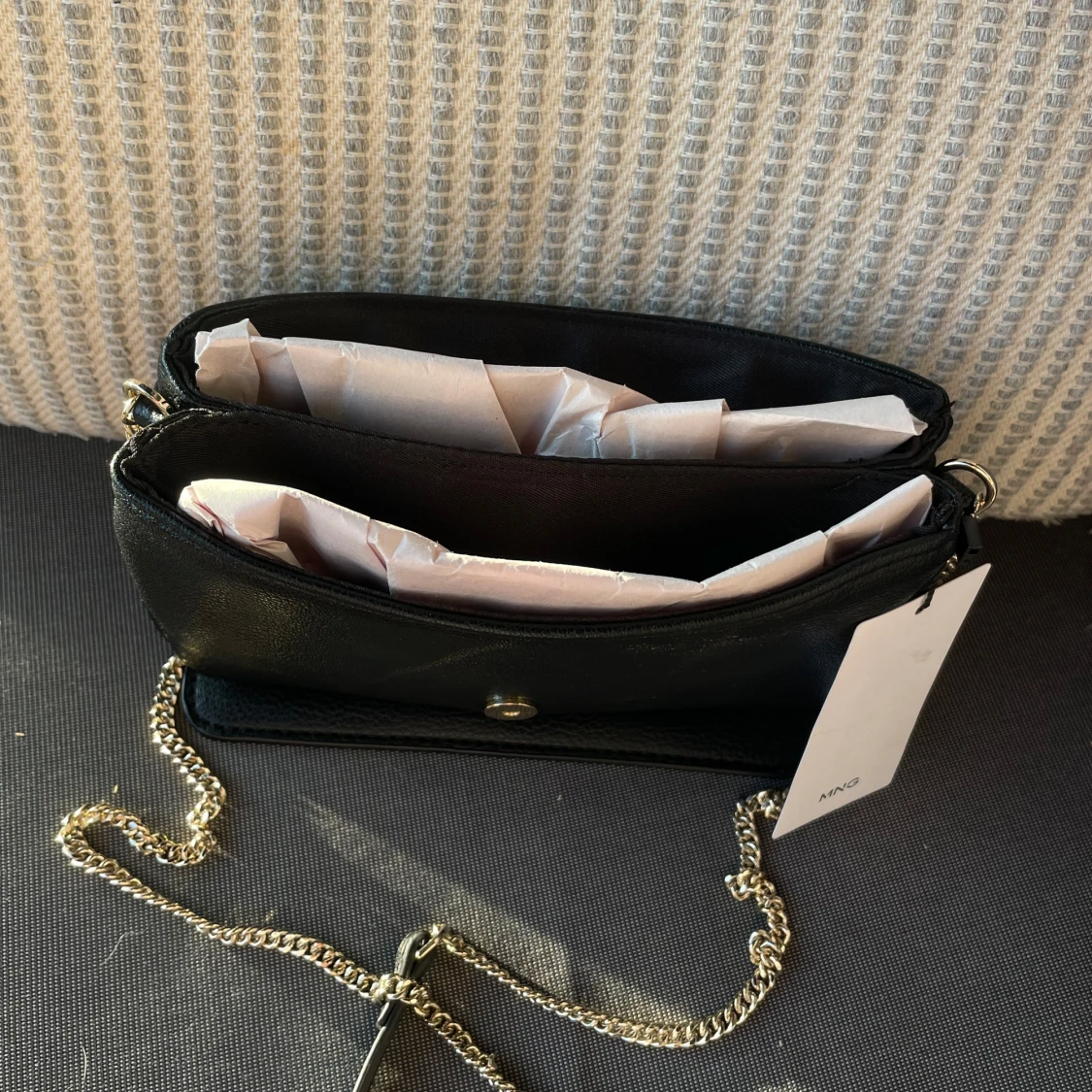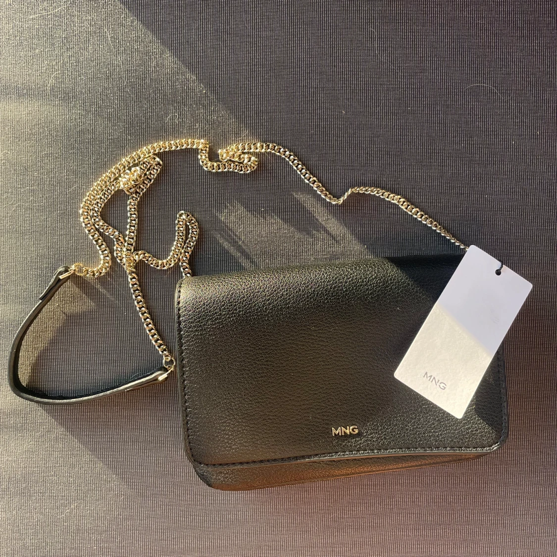 Snygg svart axelväska från Mango med guldfärgad kedjerem. Väskan har två fack och stängs med tryckknapp. Tillverkad i syntetmaterial med diskret MNG-logo framtill. Perfekt storlek för mobil, plånbok och småprylar. Nypris: 250kr