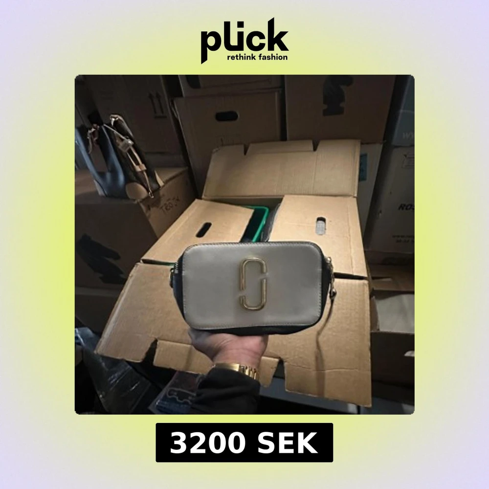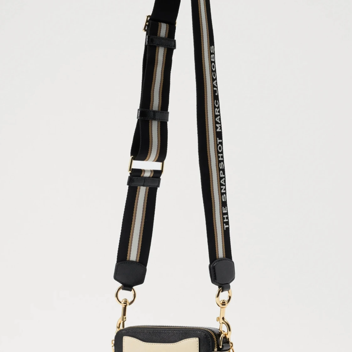 Snygg och trendig Snapshot axelväska från Marc Jacobs i beige och svart skinn med guldfärgad logodetalj framtill. Väskan har två fack med dragkedja och en bred, randig axelrem med justerbar längd och logotyp. Perfekt storlek för mobil, plånbok och småsaker.
