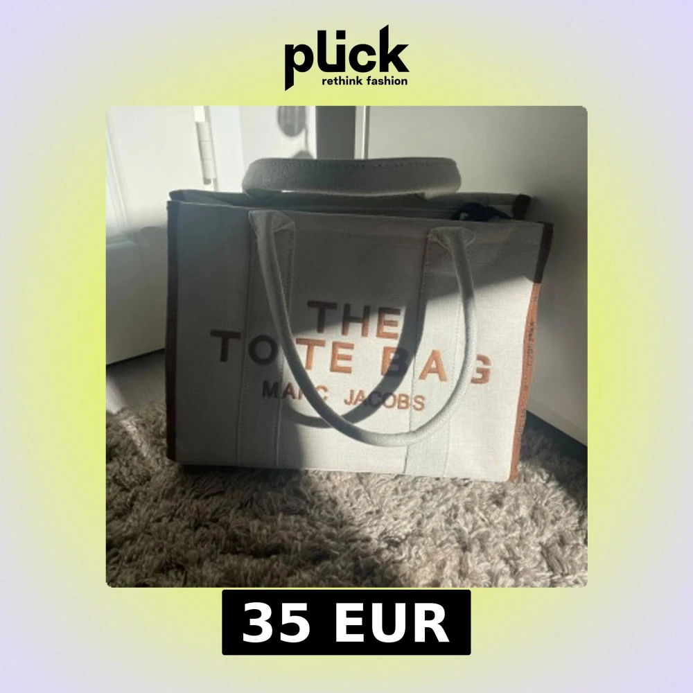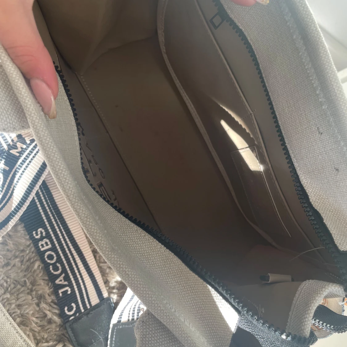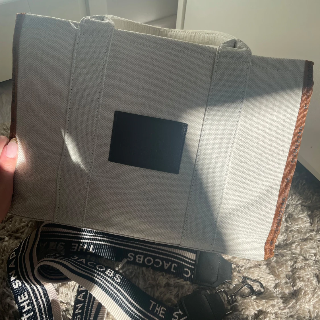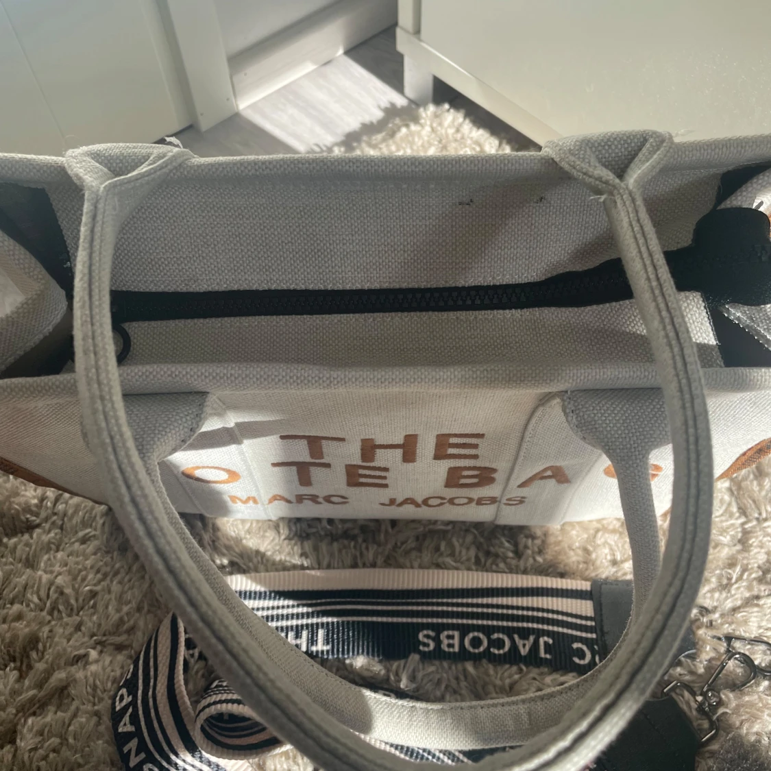 Snygg och rymlig shoppingväska från Marc Jacobs i beige canvas med bruna detaljer och tydlig logga framtill. Väskan har både handtag och en avtagbar axelrem med svartvita ränder. Praktisk dragkedja upptill och svart läderpatch på baksidan. Inte äkta!