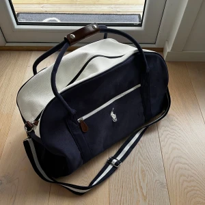 Snygg axelväska i blått och vitt från Ralph Lauren. Väskan har en praktisk dragkedja och en justerbar axelrem. Den är tillverkad i syntetmaterial med bruna skinnliknande detaljer. Perfekt för en stilren look.