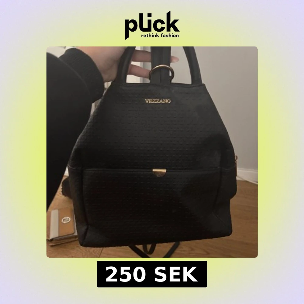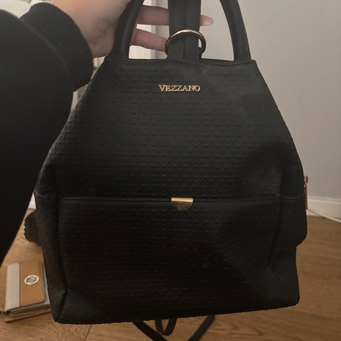 Snygg svart ryggsäck från Vezzano med gulddetaljer och strukturerad yta. Praktiskt ytterfack framtill och stilrena handtag upptill. Perfekt för dig som vill ha en stilren och funktionell väska till vardagen.