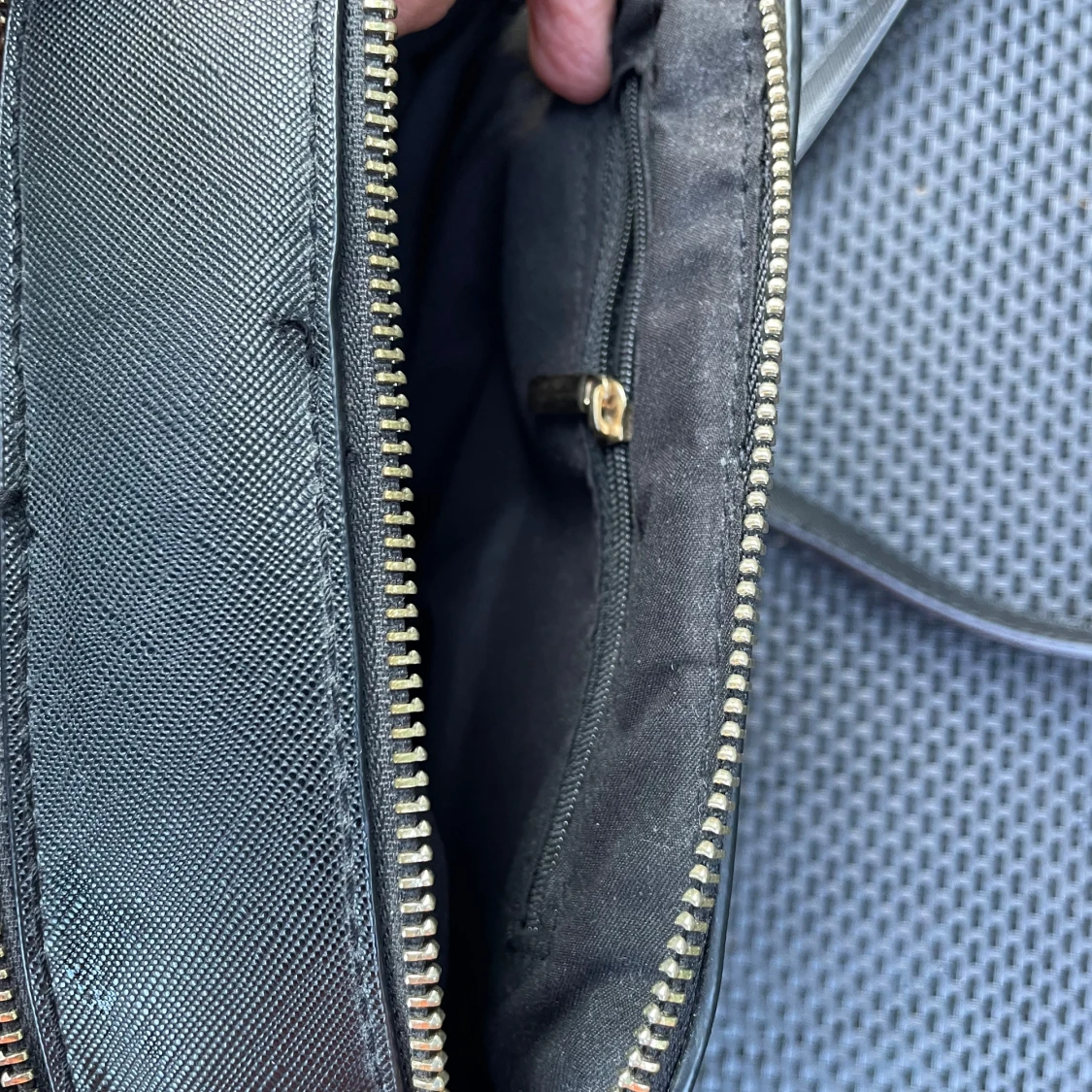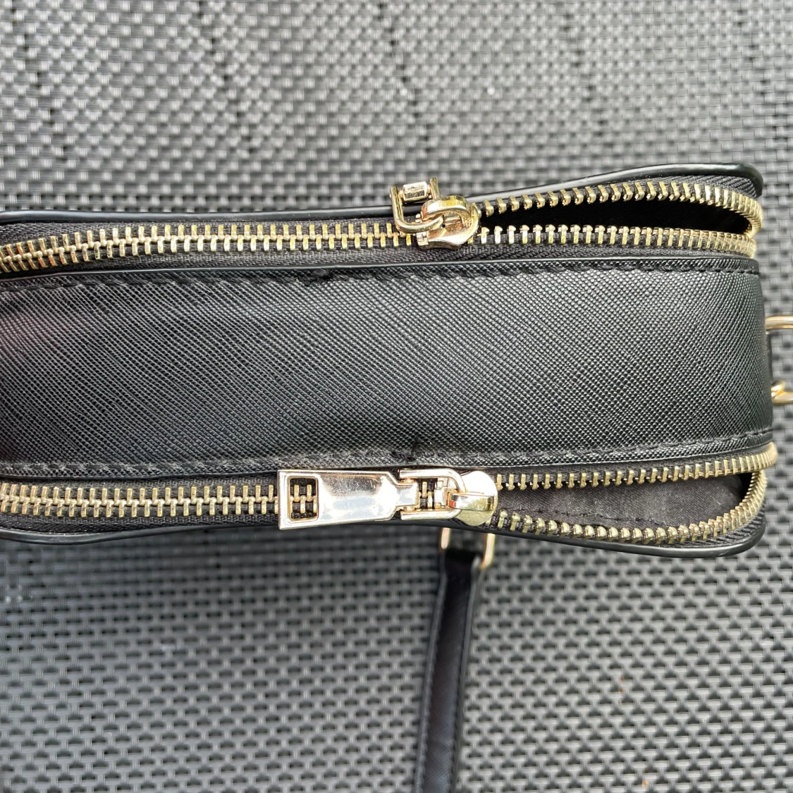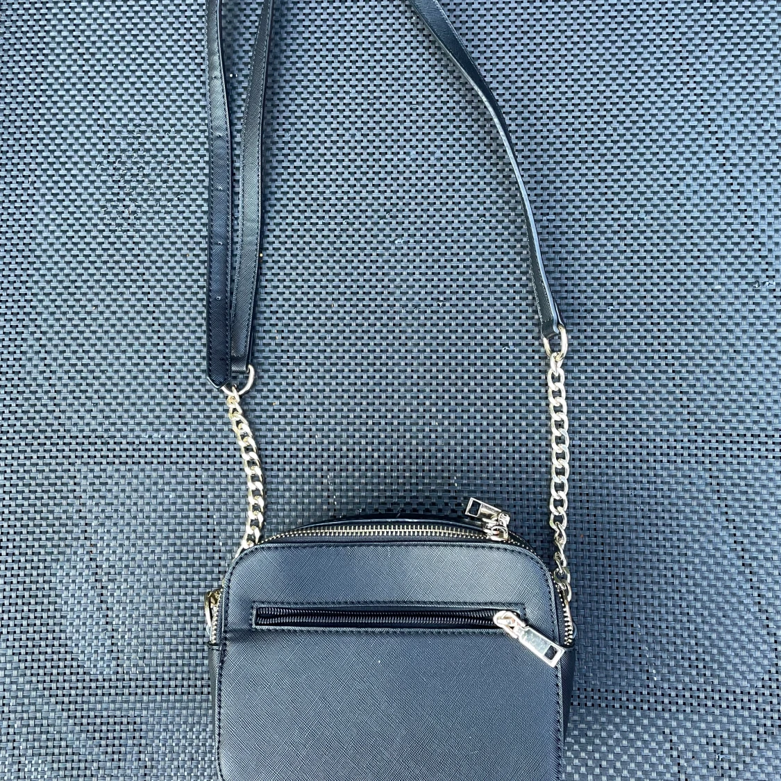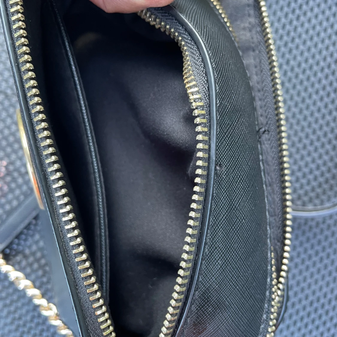 Snygg svart axelväska från Michael Kors i skinn med många fack, guldfärgade kedjedetaljer och dragkedjor. Väskan har rundade kanter, MK-logga framtill och justerbar axelrem i både läder och kedja. Perfekt storlek för det viktigaste och stilren look.
