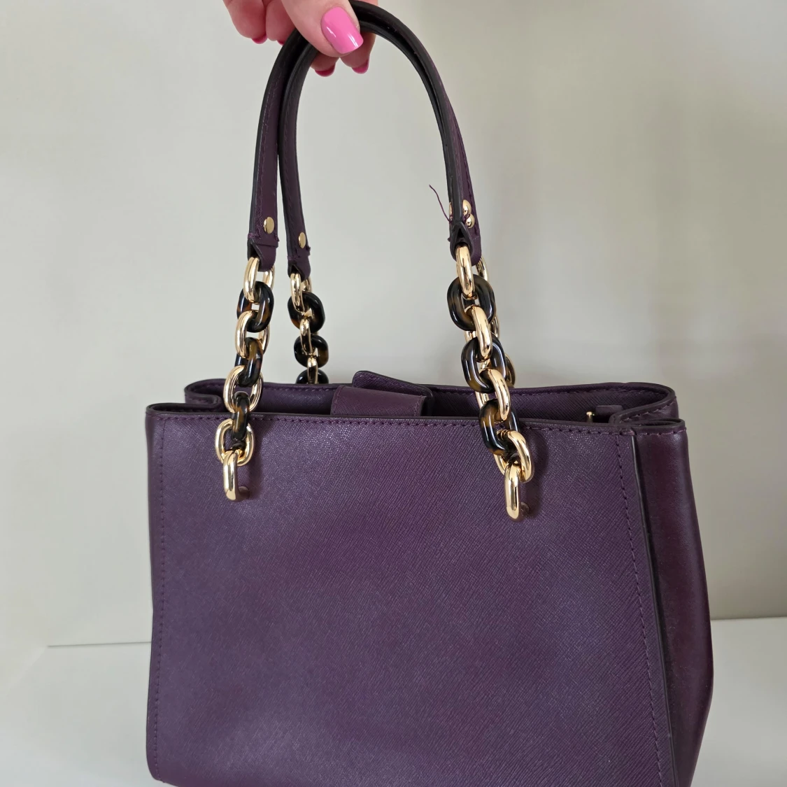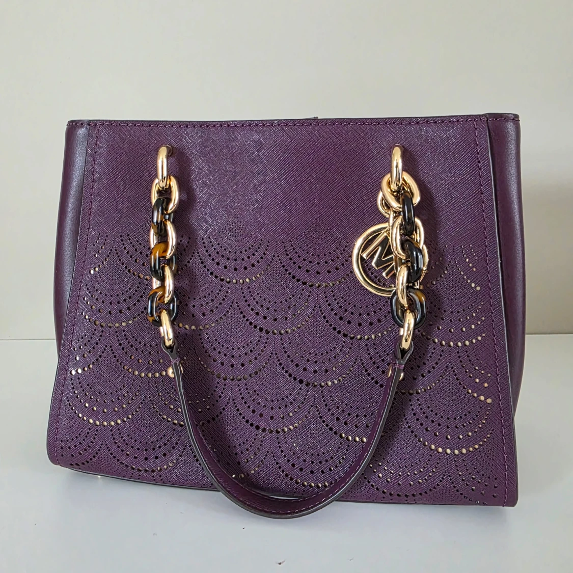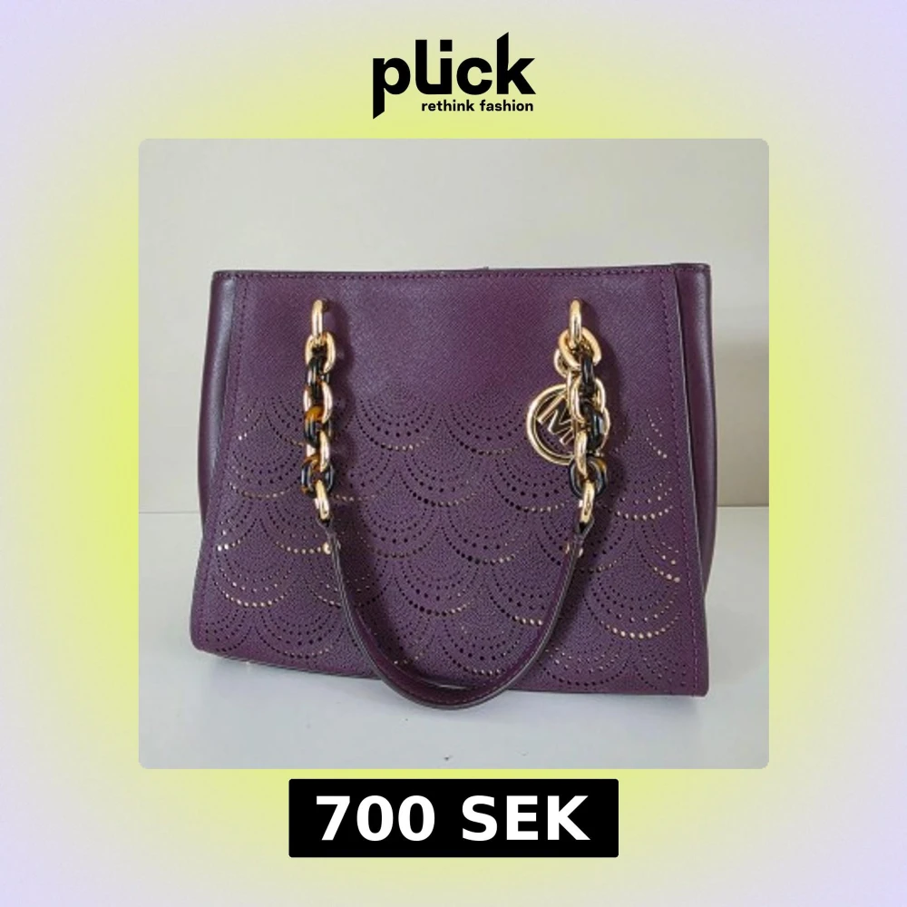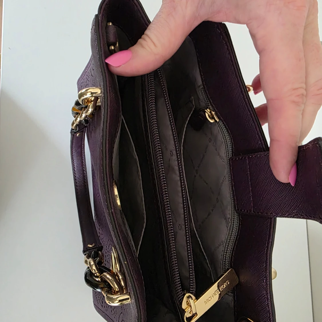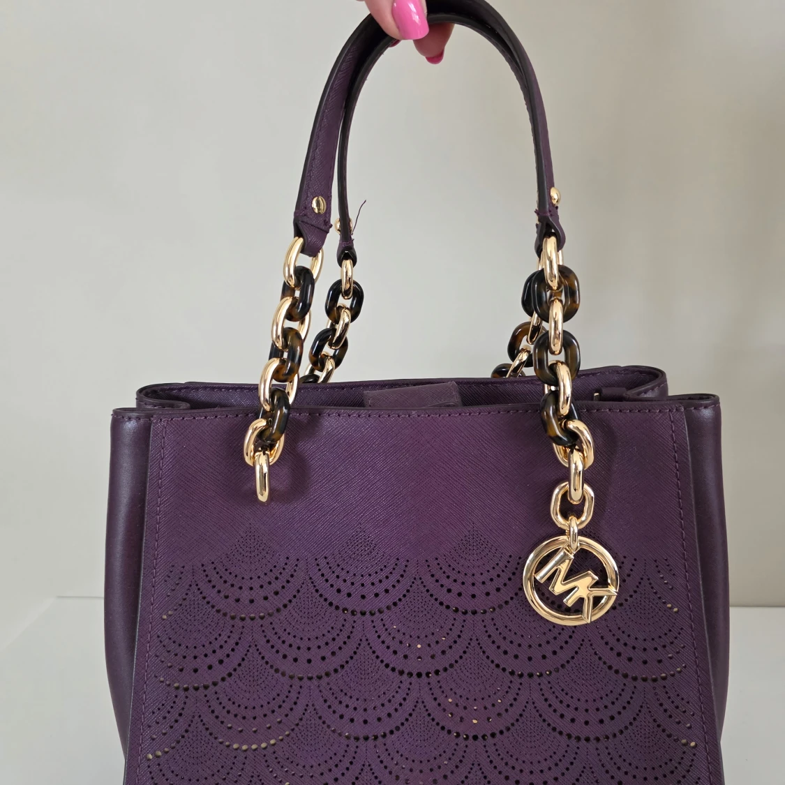 Lila handväska från Michael Kors med guldfärgade kedjehandtag och dekorativt MK-hänge. Väskan har ett perforerat mönster framtill och flera fack inuti, inklusive ett med dragkedja. Se profil för fler väskor i nytt/mycket bra skick