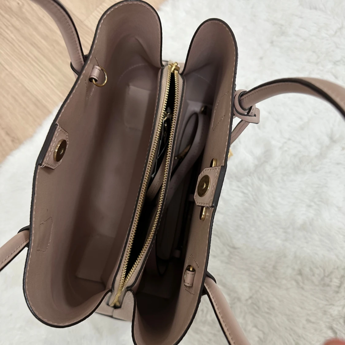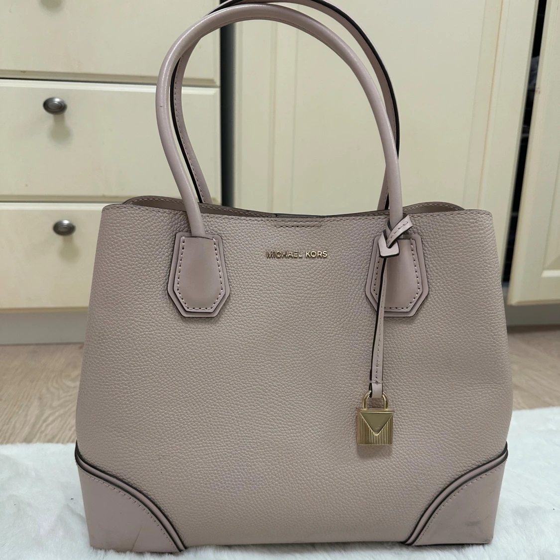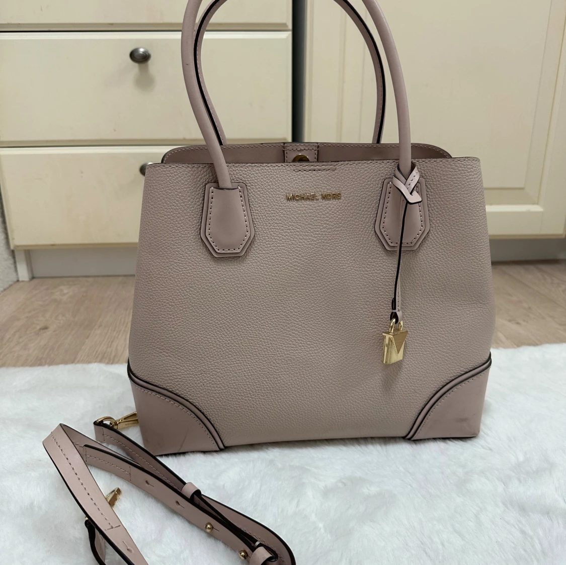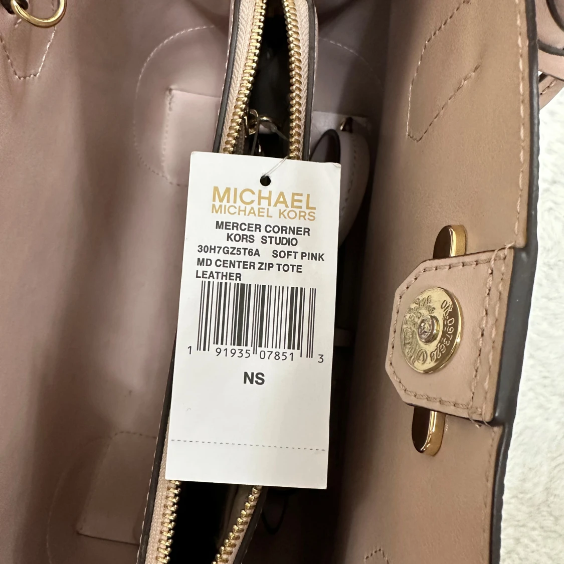 Stilren handväska i mjukt rosa skinn från Michael Kors, Mercer Corner-modell. Väskan har guldfärgade detaljer, dubbla handtag, avtagbar axelrem och mittfack med dragkedja. Aldrig använt, med tagg. Pris kan diskuteras.