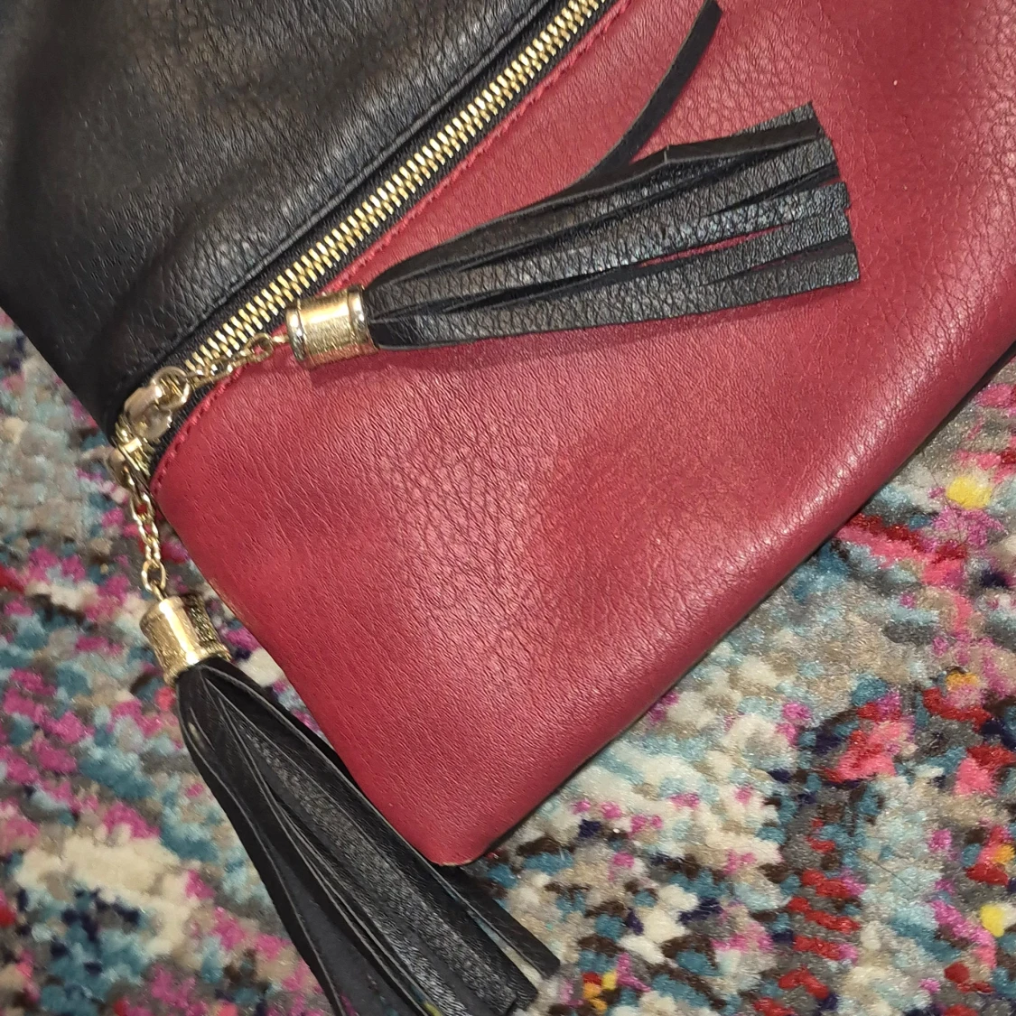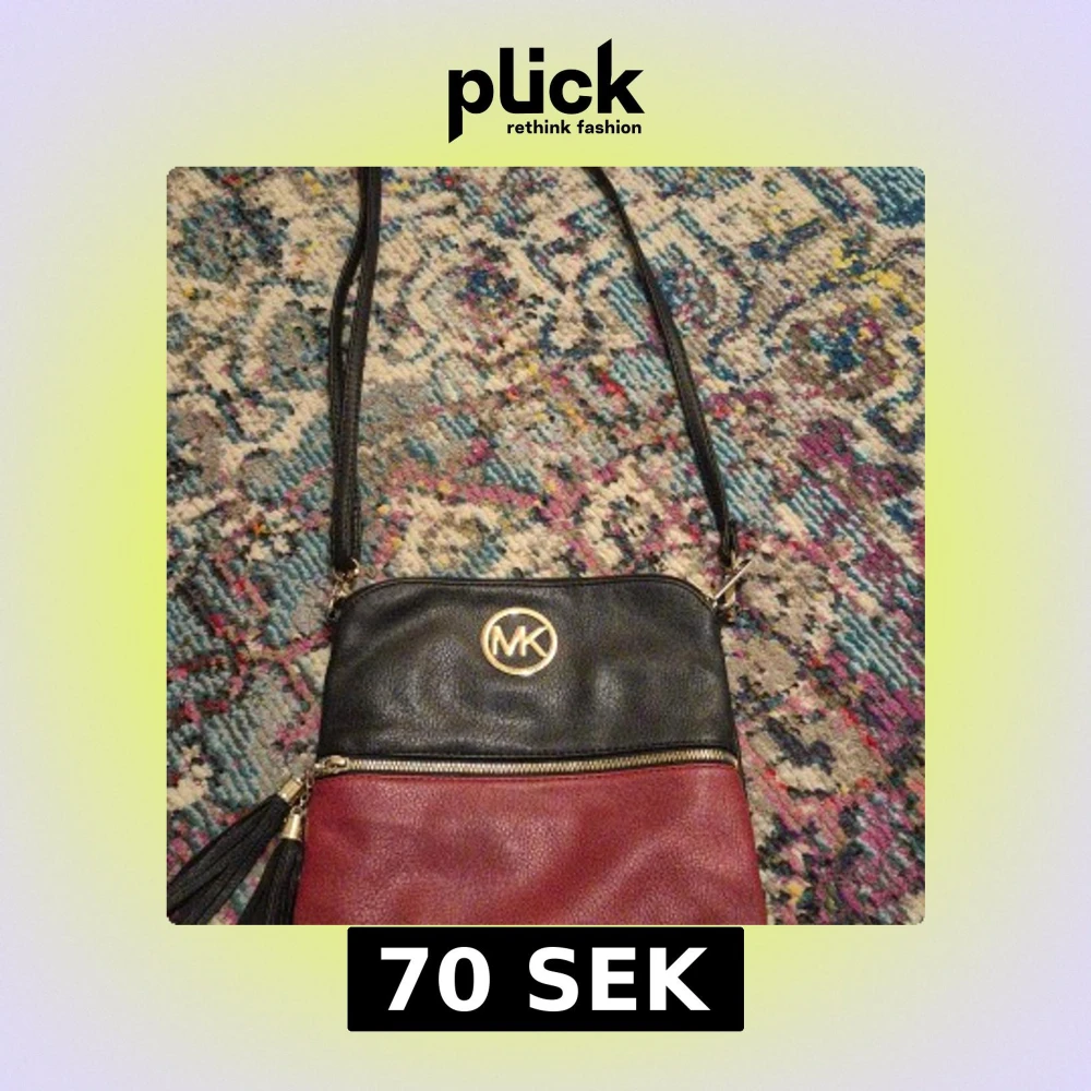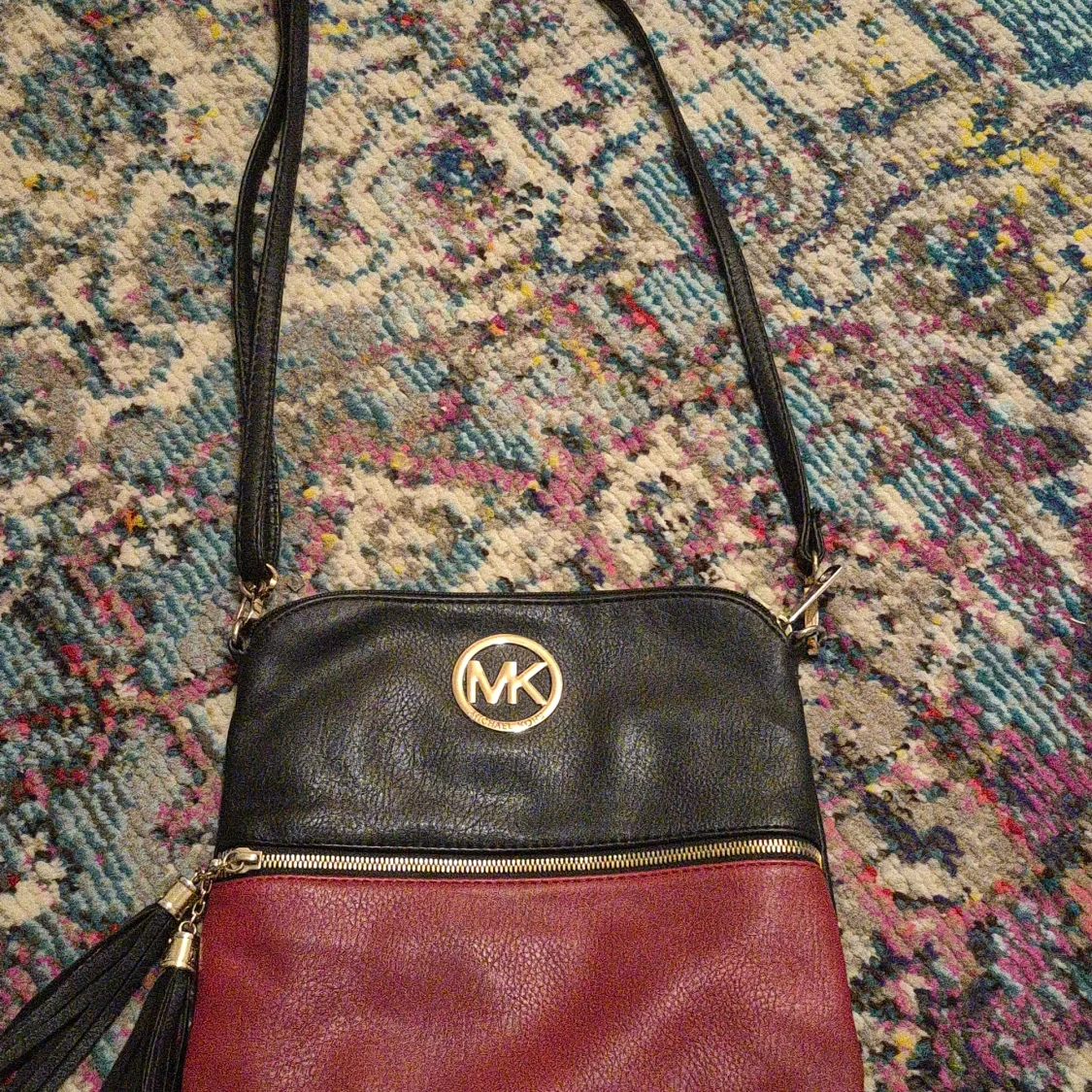 Säljer en snygg axelväska från Michael Kors i svart och vinrött med guldfärgade detaljer och tofsar. Väskan har dragkedja och ett stort MK-emblem framtill. Perfekt för dig som vill ha en stilren accessoar med plats för det viktigaste.