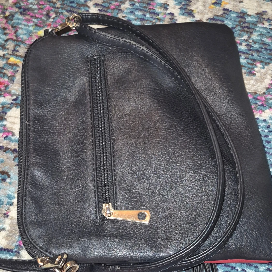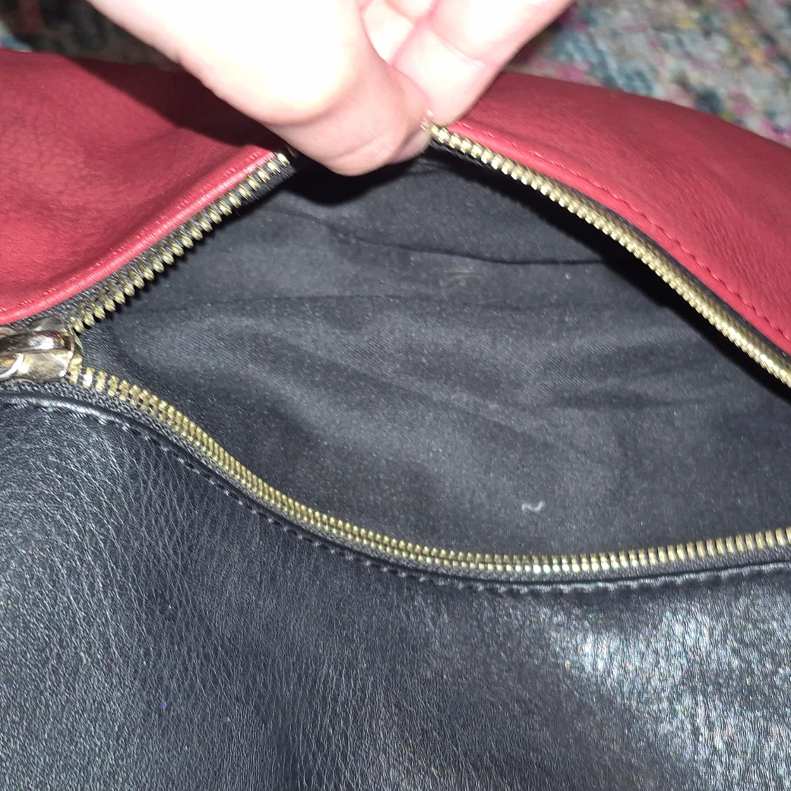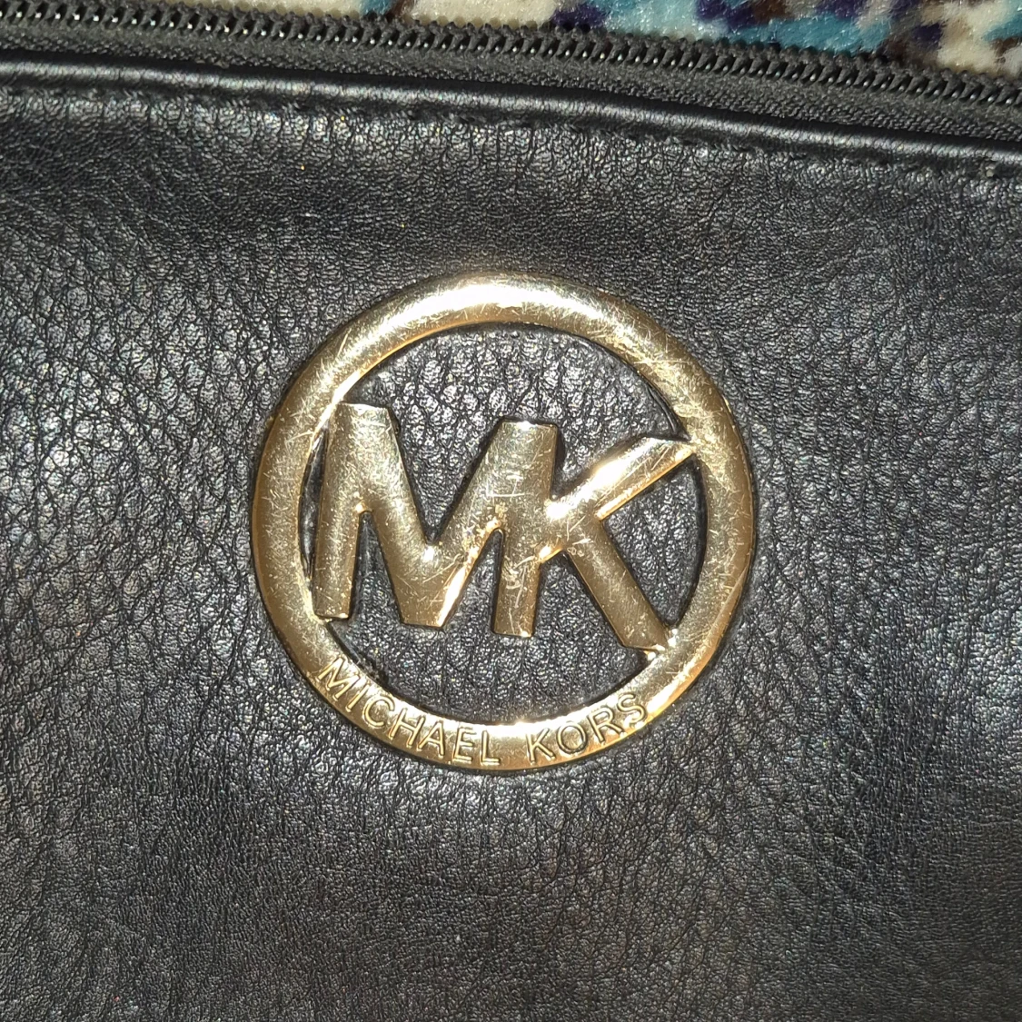 Säljer en snygg axelväska från Michael Kors i svart och vinrött med guldfärgade detaljer och tofsar. Väskan har dragkedja och ett stort MK-emblem framtill. Perfekt för dig som vill ha en stilren accessoar med plats för det viktigaste.