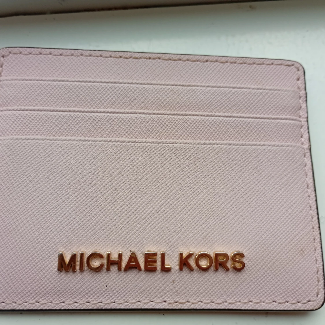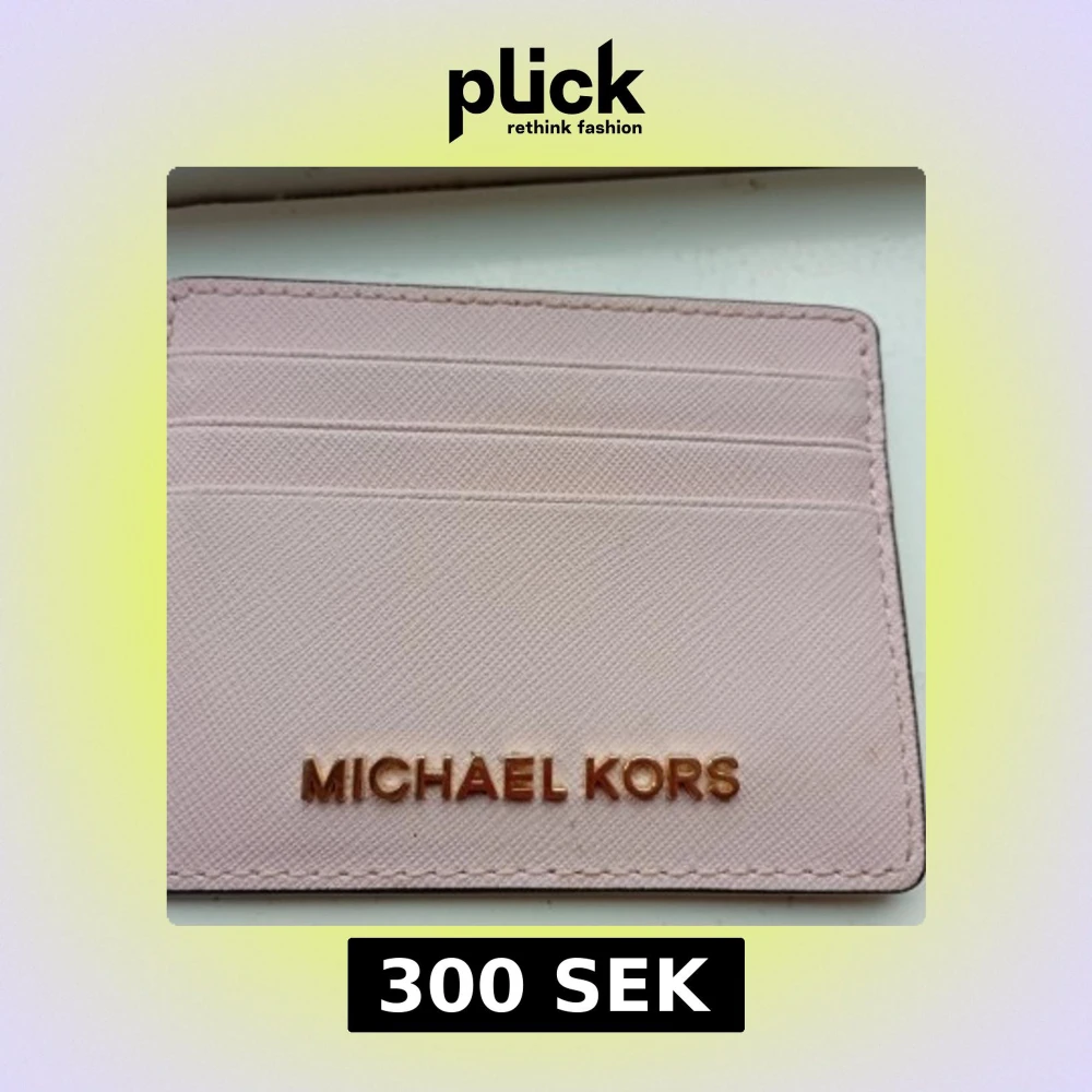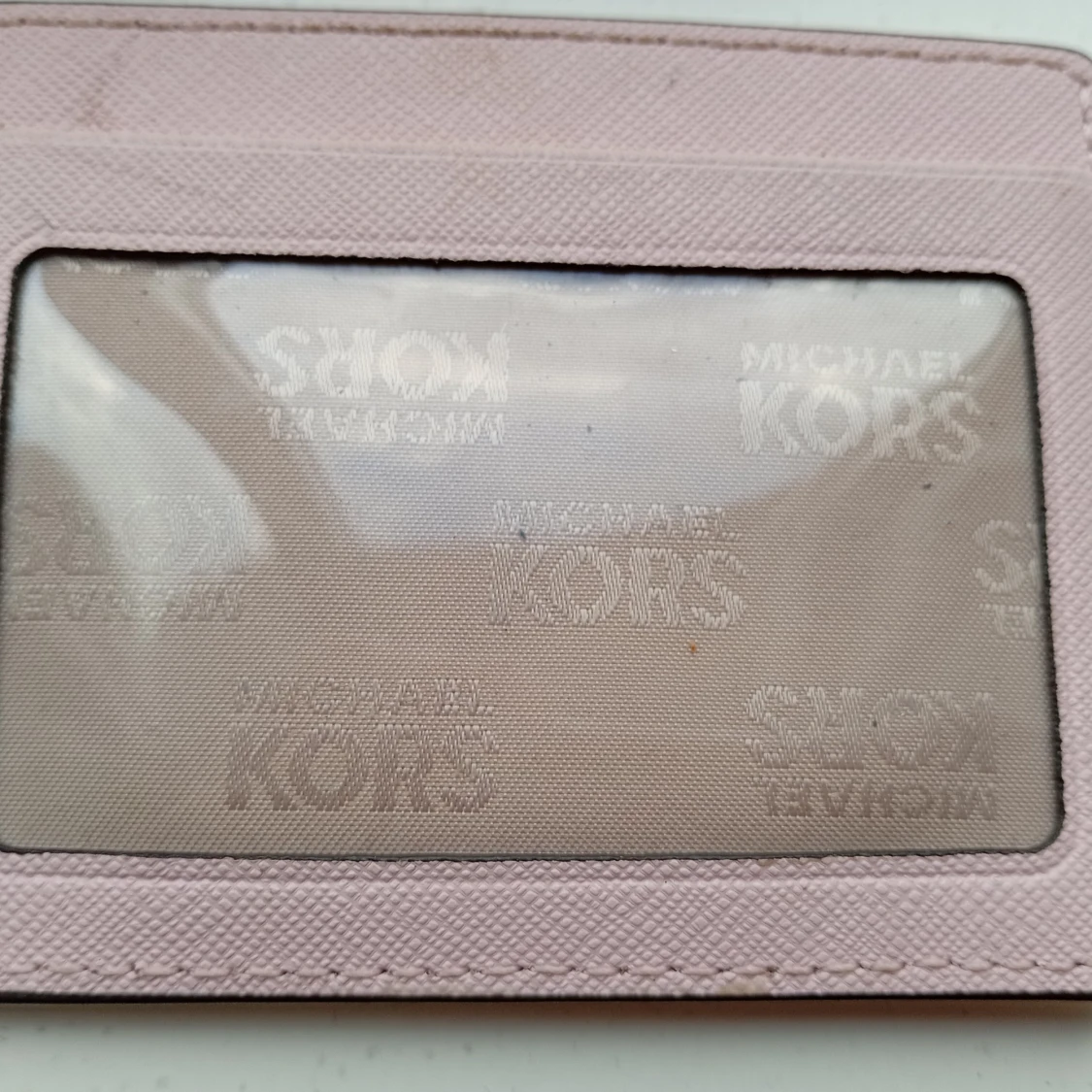 Snygg och stilren rosa plånbok från Michael Kors med flera kortfack och ett fönster för ID eller busskort. Plånboken har guldfärgad logotyp framtill och är tillverkad i ett strukturerat syntetmaterial som känns lyxigt och modernt.