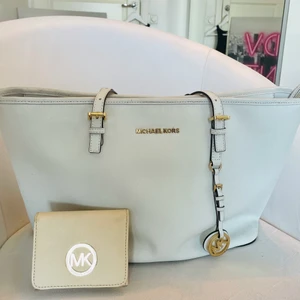 Vit Michael Kors väska med guld detaljer och en plånbok medföljer, både väskan och plånboken är äkta Michael Korse. Dustbag till väskan medföljer. Finns att hämta på Södermalm, kan skickas.