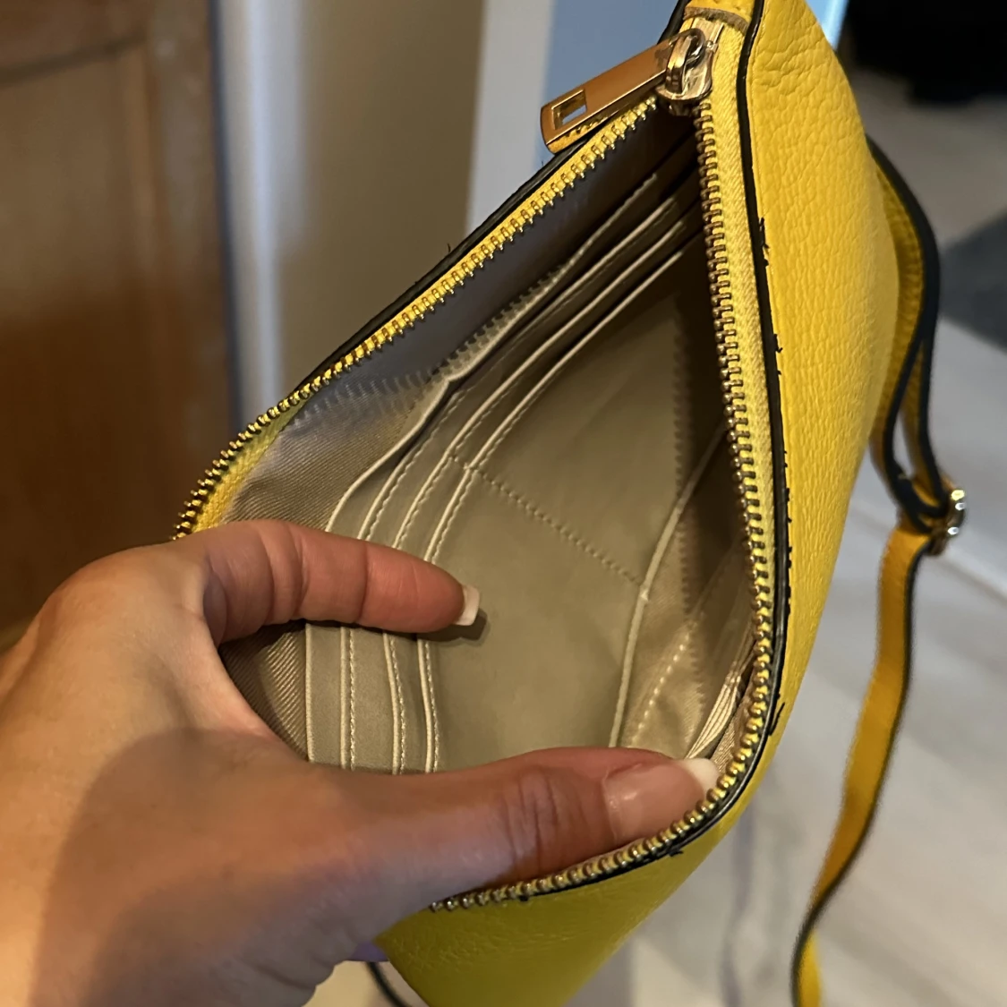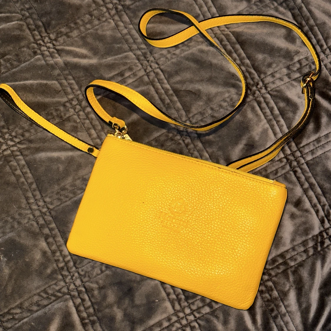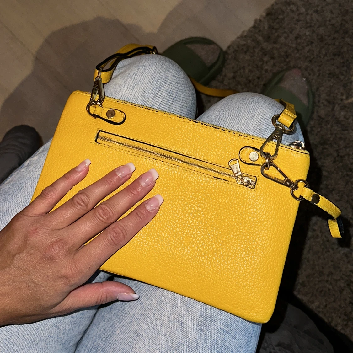 Liten solgul väska med axelrem och vristrem använd 2ggr. Som ny!