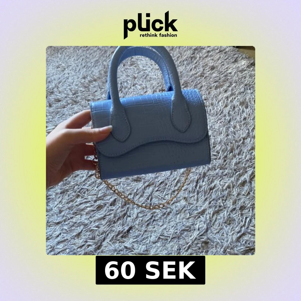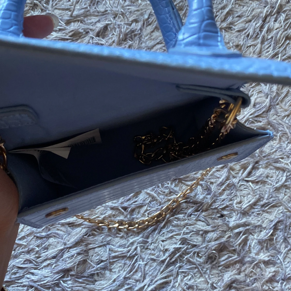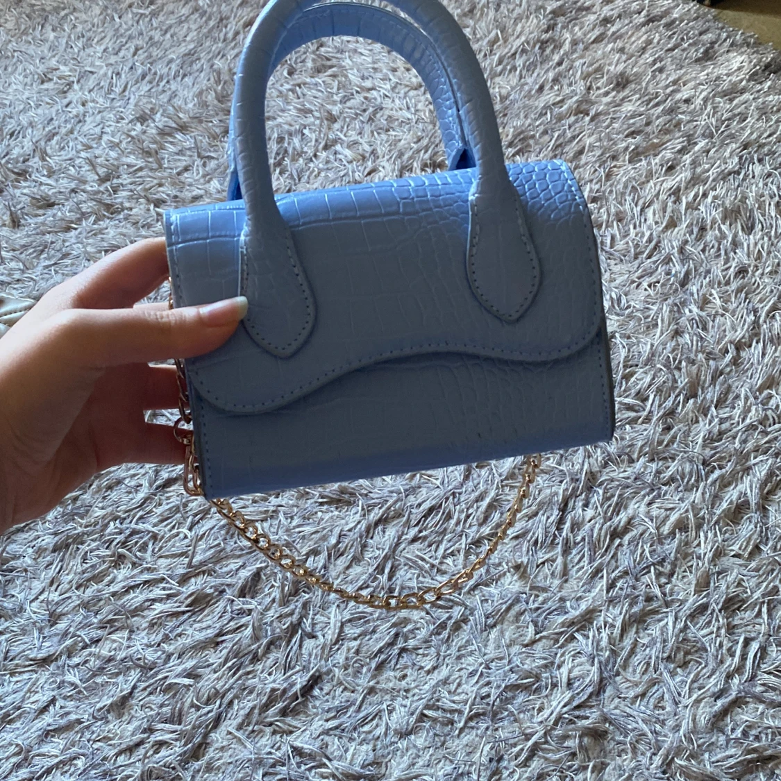 Snygg ljusblå axelväska med krokodilmönster och guldkedja. Perfekt för att ge en touch av stil till din outfit. Väskan har ett handtag och en kedja för att bäras över axeln.💖