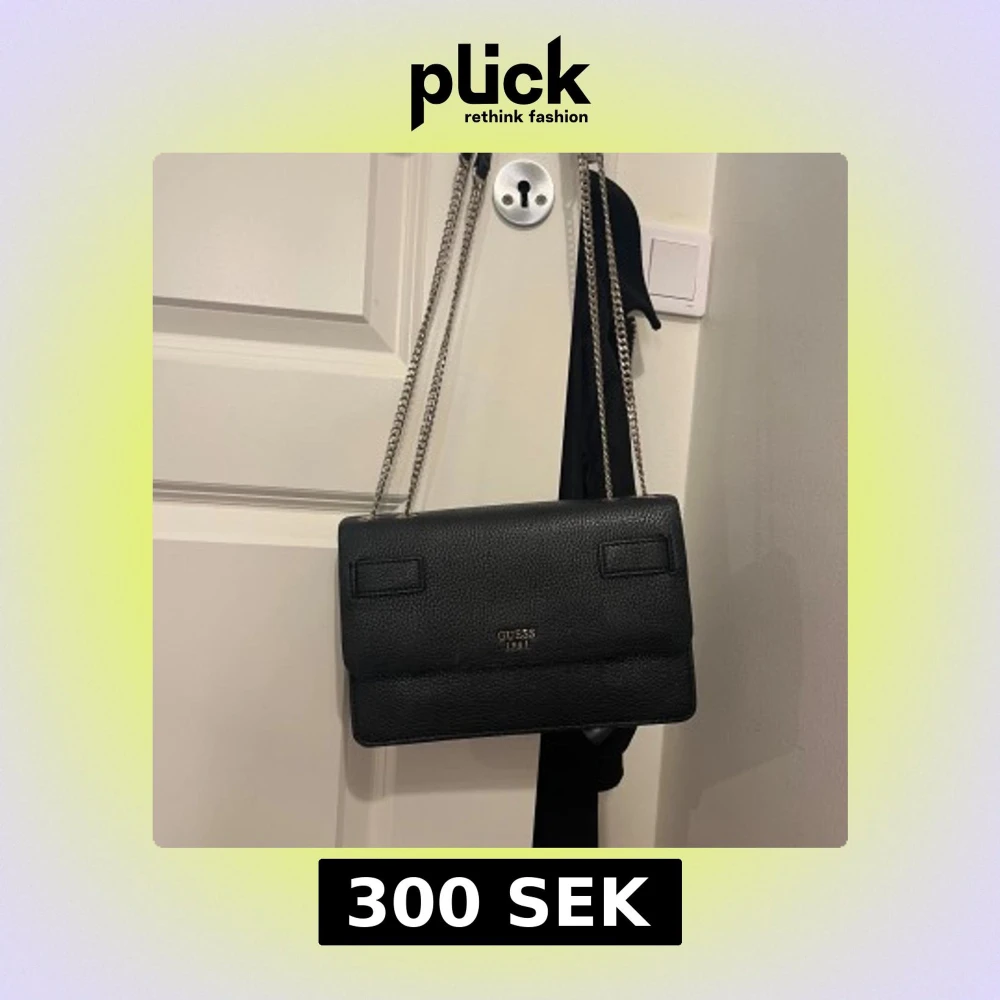 Snygg svart axelväska från Guess med kedjerem och guldfärgad logga framtill. Väskan är i skinnimitation, lite skadad därav har priset sänkts. Men inget som märks. PRISET KAN FÖRHANDLAS