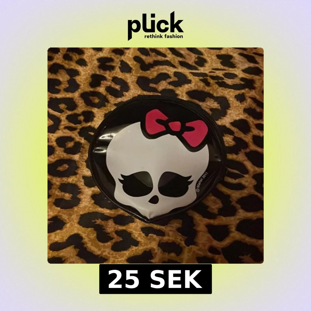 Plånbok/miniväska med ett dödskallemotiv i vitt och en rosa rosett. Perfekt för att förvara småsaker. Den har en praktisk dragkedja och är lätt att bära med sig.