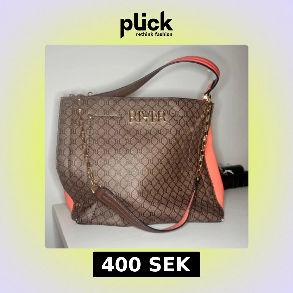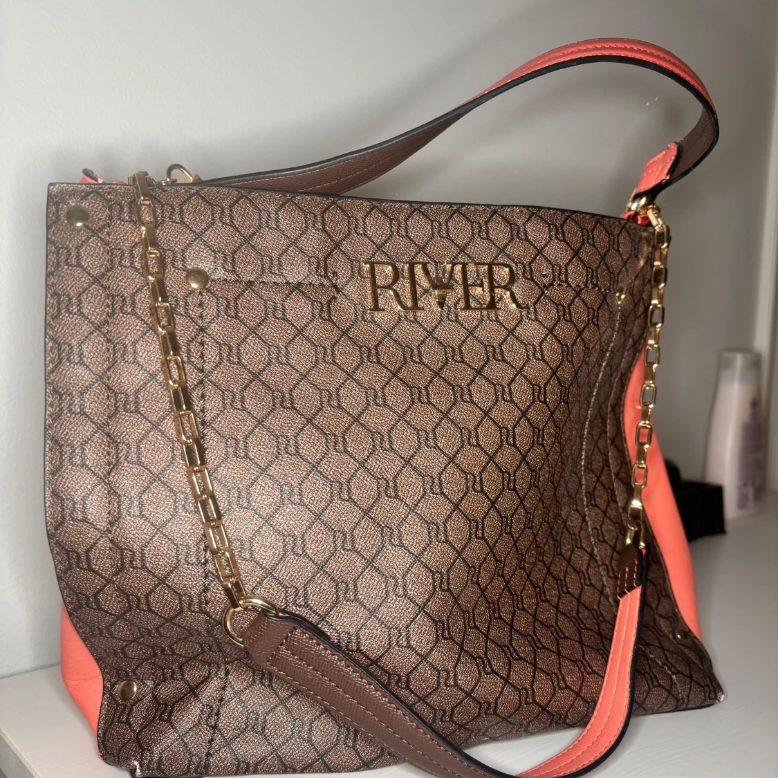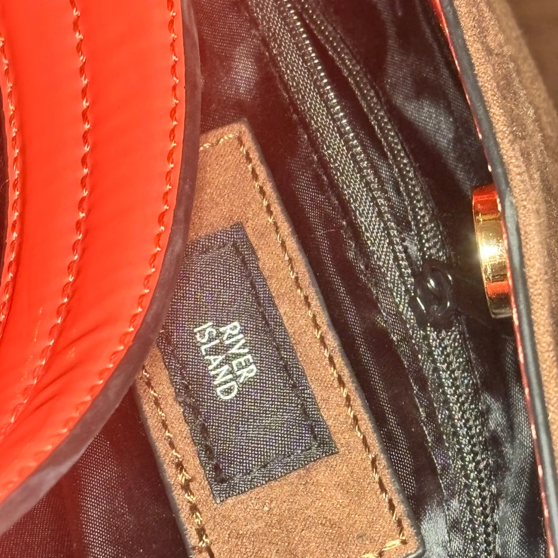 Snygg axelväska från River Island i brunt med geometriskt mönster och detaljer i guld. Väskan har kedjerem, inslag av orange på sidorna och insida, samt logga framtill. Perfekt för dig som vill sticka ut med en trendig accessoar.