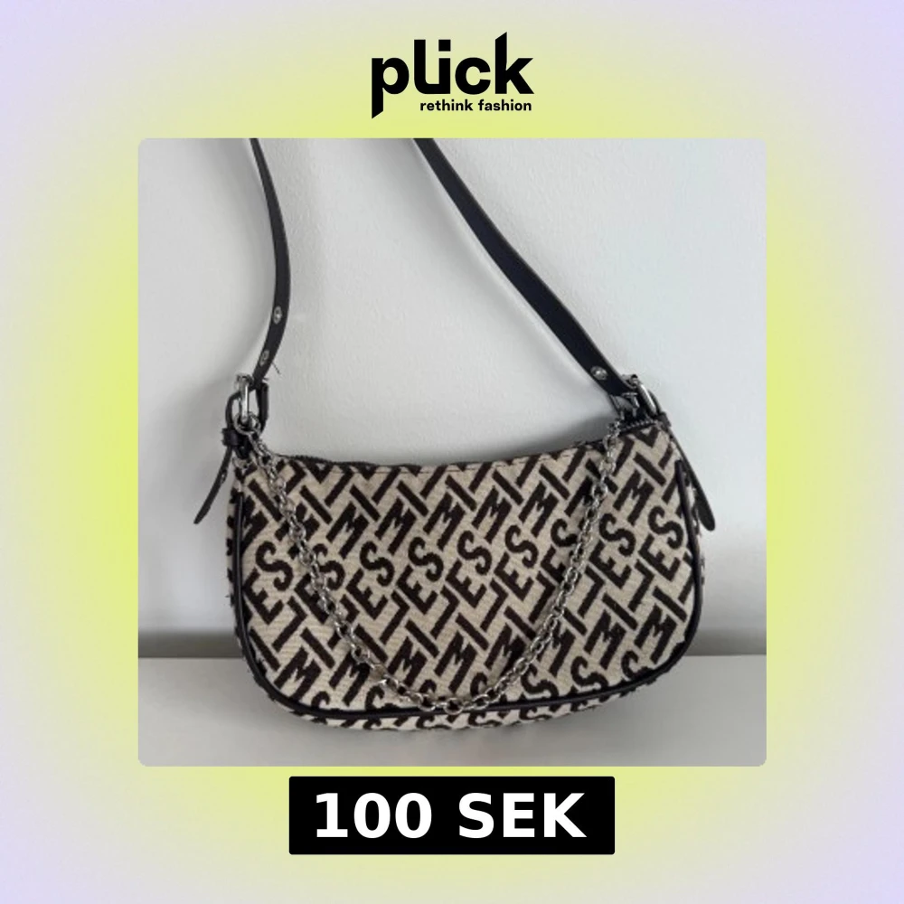 Snygg axelväska med ett unikt mönster i svart och beige. Väskan har en stilren kedjedetalj och justerbar axelrem. Något smutsig på insidan
