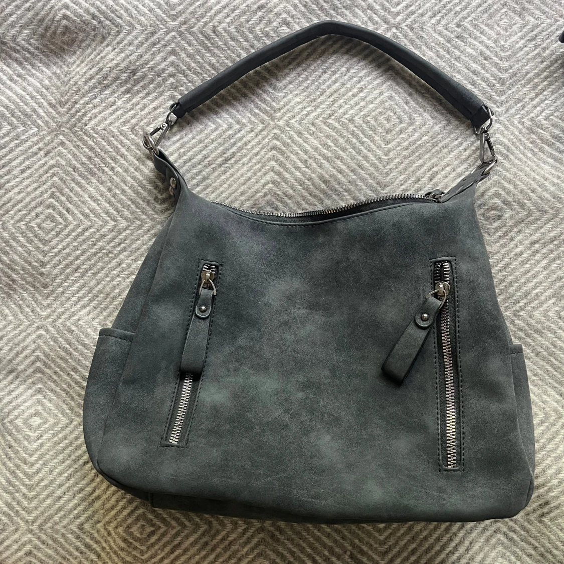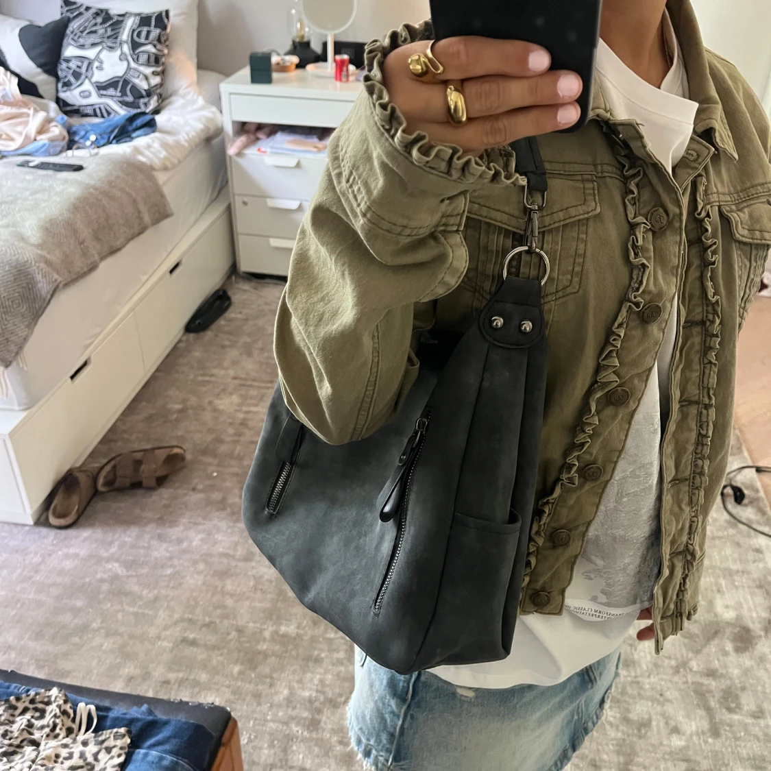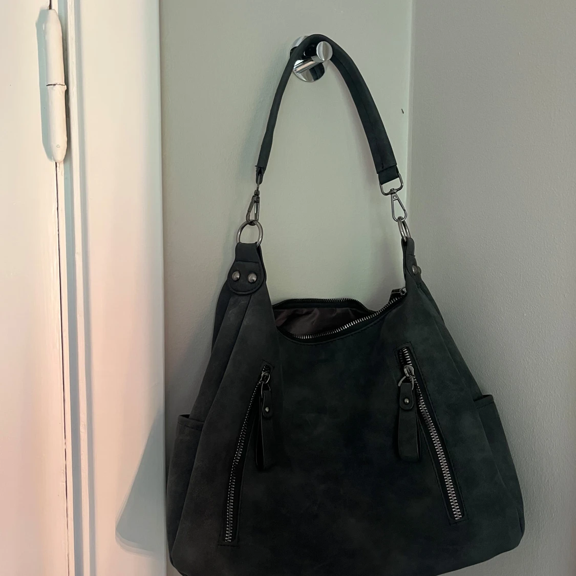 Säljer en stilren mörkgrå axelväska med mjuk mocka-look. Väskan har bred axelrem, två dragkedjefickor framtill och en bak, samt öppna sidofack. Perfekt för dig som vill ha plats för allt du behöver och ändå se snygg ut. Helt oanvänd.