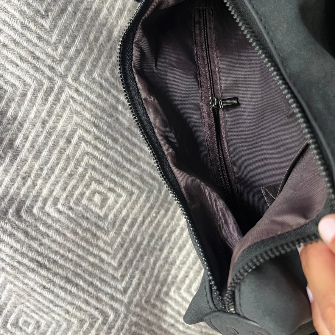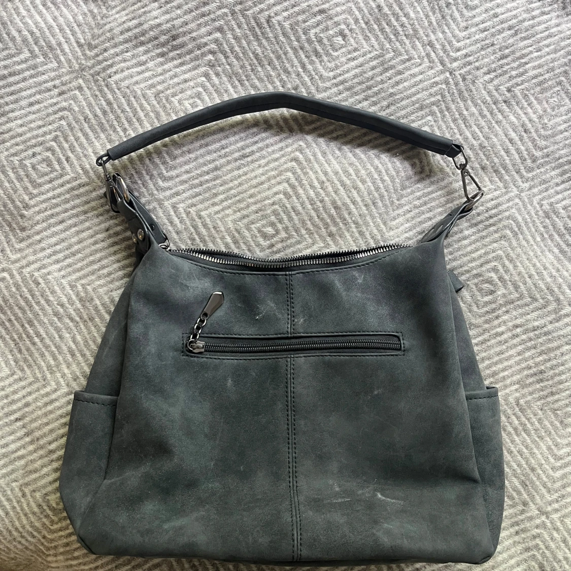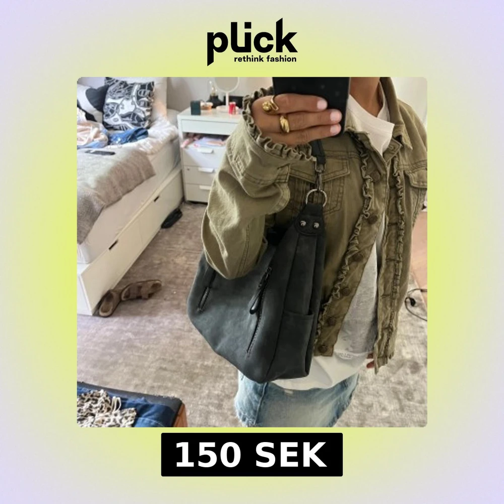 Säljer en stilren mörkgrå axelväska med mjuk mocka-look. Väskan har bred axelrem, två dragkedjefickor framtill och en bak, samt öppna sidofack. Perfekt för dig som vill ha plats för allt du behöver och ändå se snygg ut. Helt oanvänd.