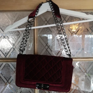 Superfin väska i mörkröd sammet med kedja. Från Nelly. Aldrig använd men lapparna är borta. Mycket fint skick.