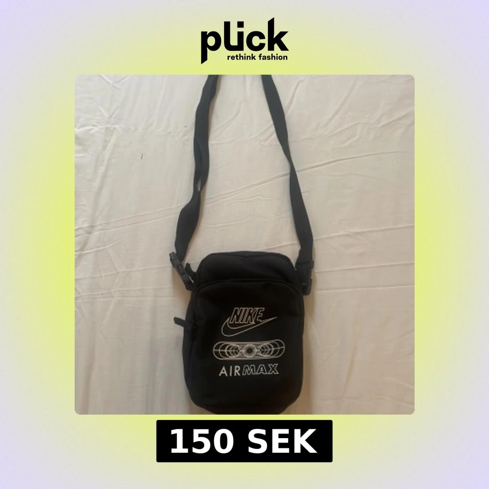 Snygg svart axelväska från Nike Air Max med justerbar rem och har två tragkedjor. Väskan har ett coolt tryck med Nike-loggan och Air Max-designen på framsidan och är använd en gång.