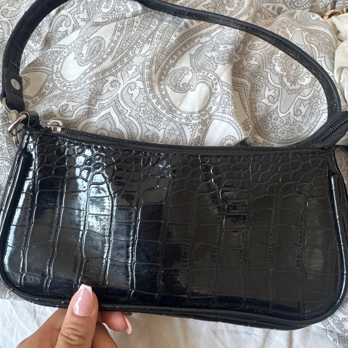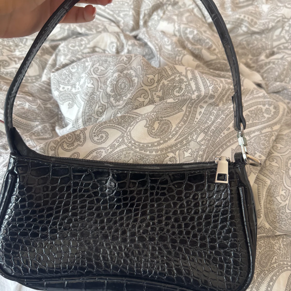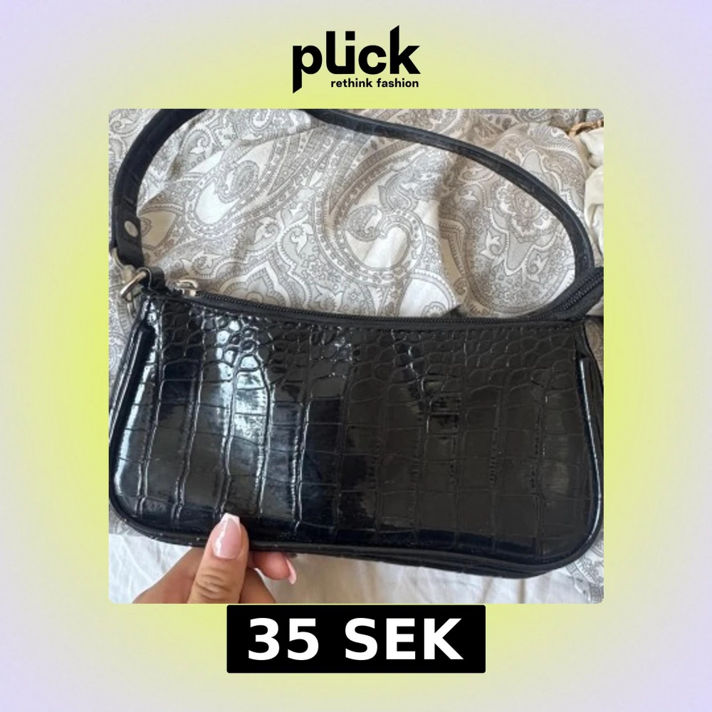 Säljer en svart axelväska med croco-mönstrad yta i glansigt syntetmaterial. Väskan har en dragkedja som är lite trög men funkar. Perfekt storlek för det viktigaste och enkel att slänga över axeln.
