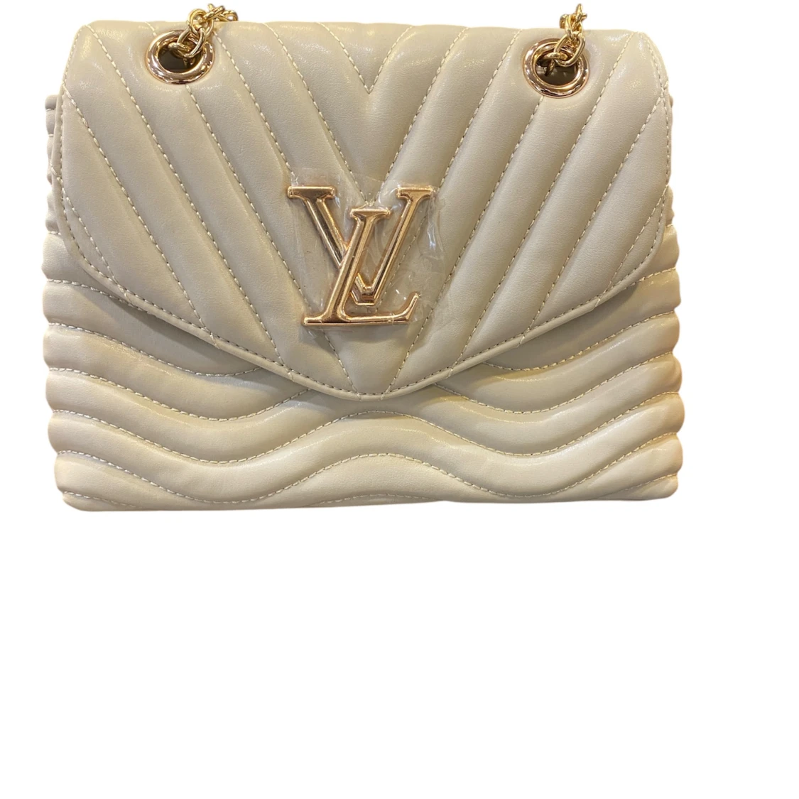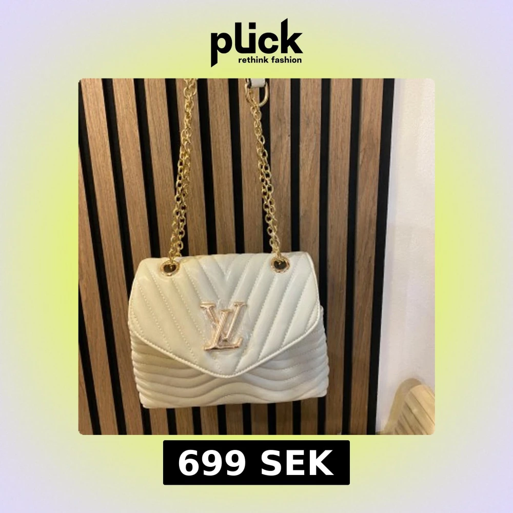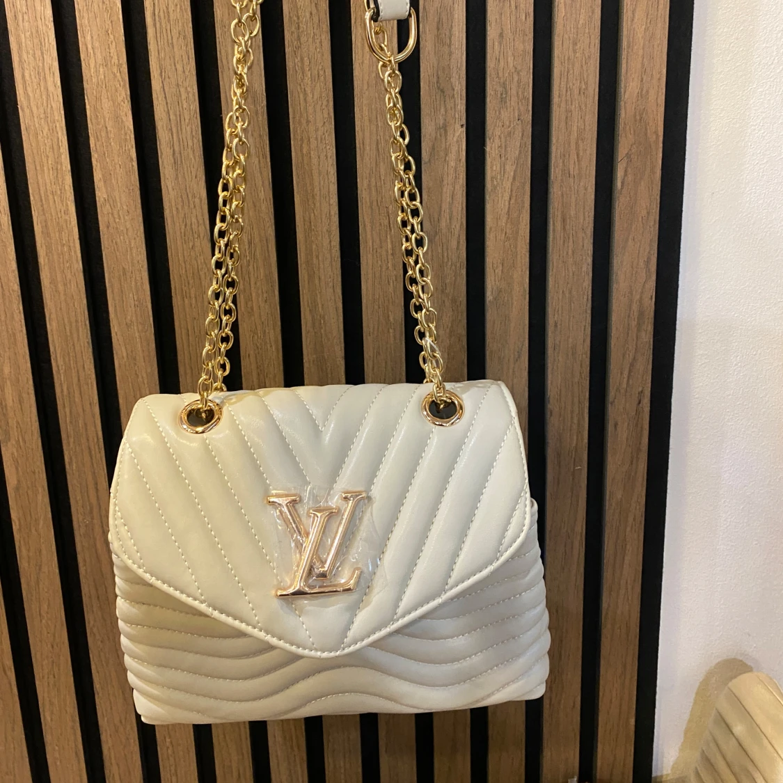 Säljer en snygg vit axelväska med guldiga kedjor och loga framtill. Väskan är quiltad i ett vågigt och V-format mönster och har en lyxig känsla med sitt mjuka skinnmaterial. Perfekt för dig som vill sticka ut med en klassisk men trendig look.