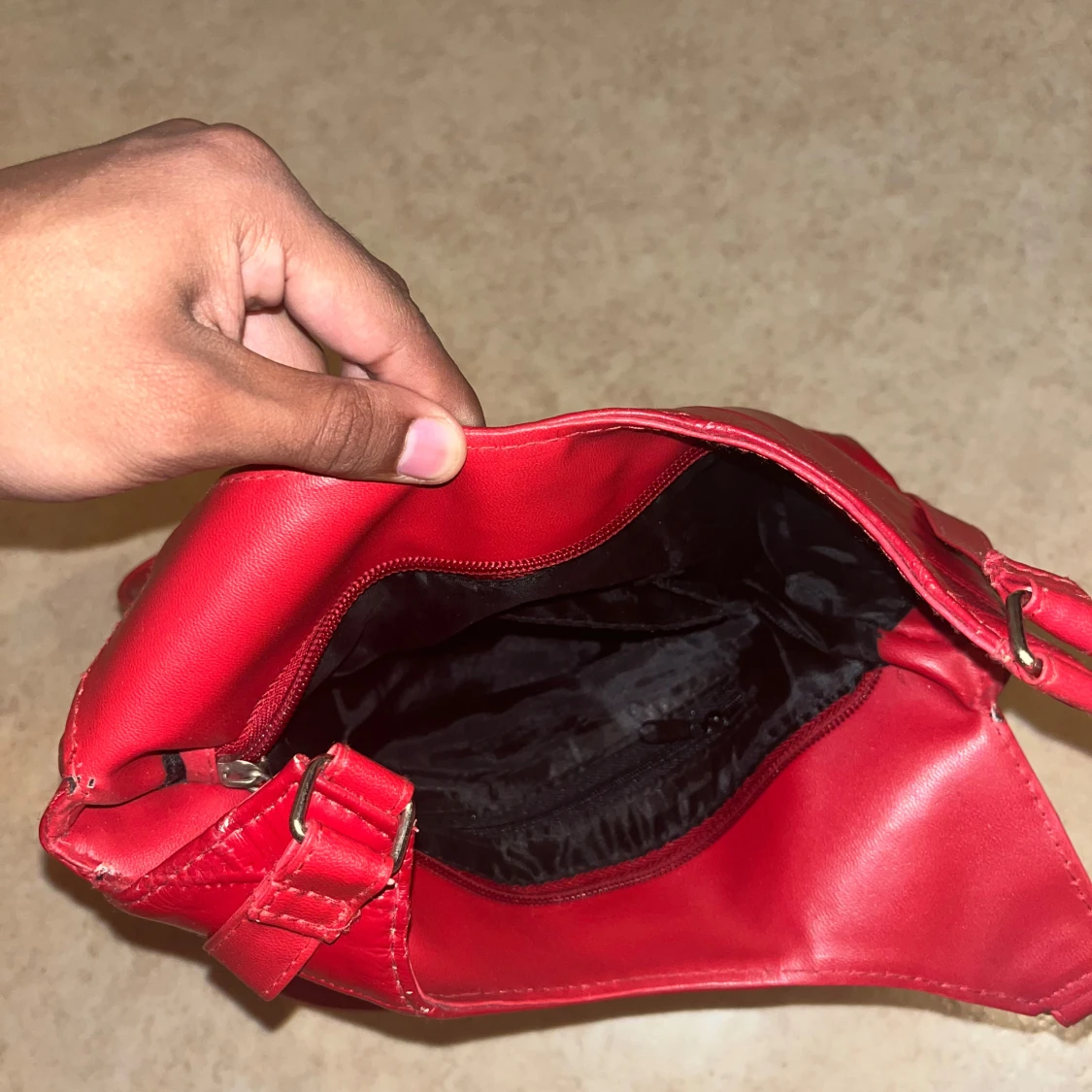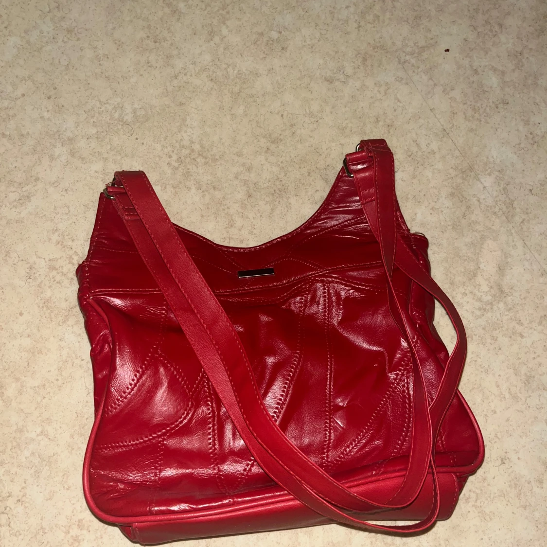 Snygg röd axelväska i skinn med justerbar axelrem. Väskan har en praktisk dragkedja på baksidan för extra förvaring. Perfekt för att liva upp din outfit med en färgklick!