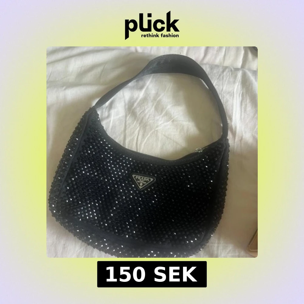 Säljer en svart axelväska med glittriga stenar över hela väskan och klassisk trekantig logga framtill. Väskan har en enkel, mjukt böjd form och stängs med dragkedja. Perfekt för dig som vill sticka ut med en lyxig accessoar.