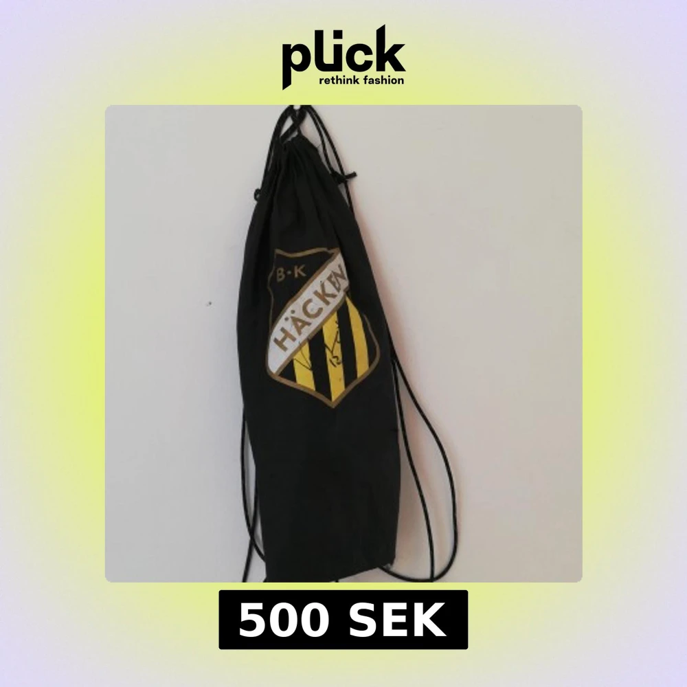 Säljer en svart gympåse med BK Häcken-logga i gult och vitt. Väskan har dragskostängning med svarta snören och är perfekt för träning eller som sportväska. Klassisk design med klubbens emblem tryckt på framsidan med en signatur på.