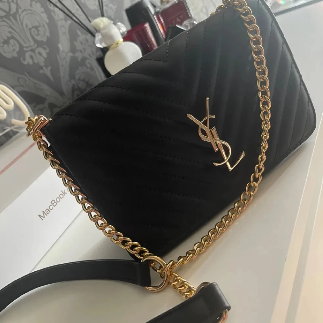 Elegant och stilren svart quiltad axelväska från YSL med guldfärgad kedja och ikonisk logotyp den perfekta accessoaren för att lyfta din outfit med en lyxig touch. Väskan har en sofistikerad design och är i nyskick, använd endast en gång! Jag säljer den eftersom jag personligen föredrar silverdetaljer framför guldfärg.