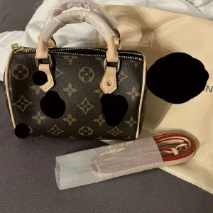 brun monogram handväska - Snygg handväska  i klassiskt monogrammönster. Väskan är brun med ljusbruna detaljer och handtag i skinn. Den har rundad form och dragkedja upptill. Perfekt för dig som gillar lyxiga accessoarer med ikonisk design. Se defekterna på bilderna💕