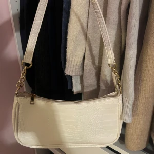 Snygg vit axelväska med krokodilmönster. Väskan har en dragkedja upptill och en stilren design som passar perfekt för olika tillfällen.