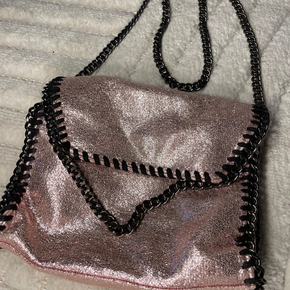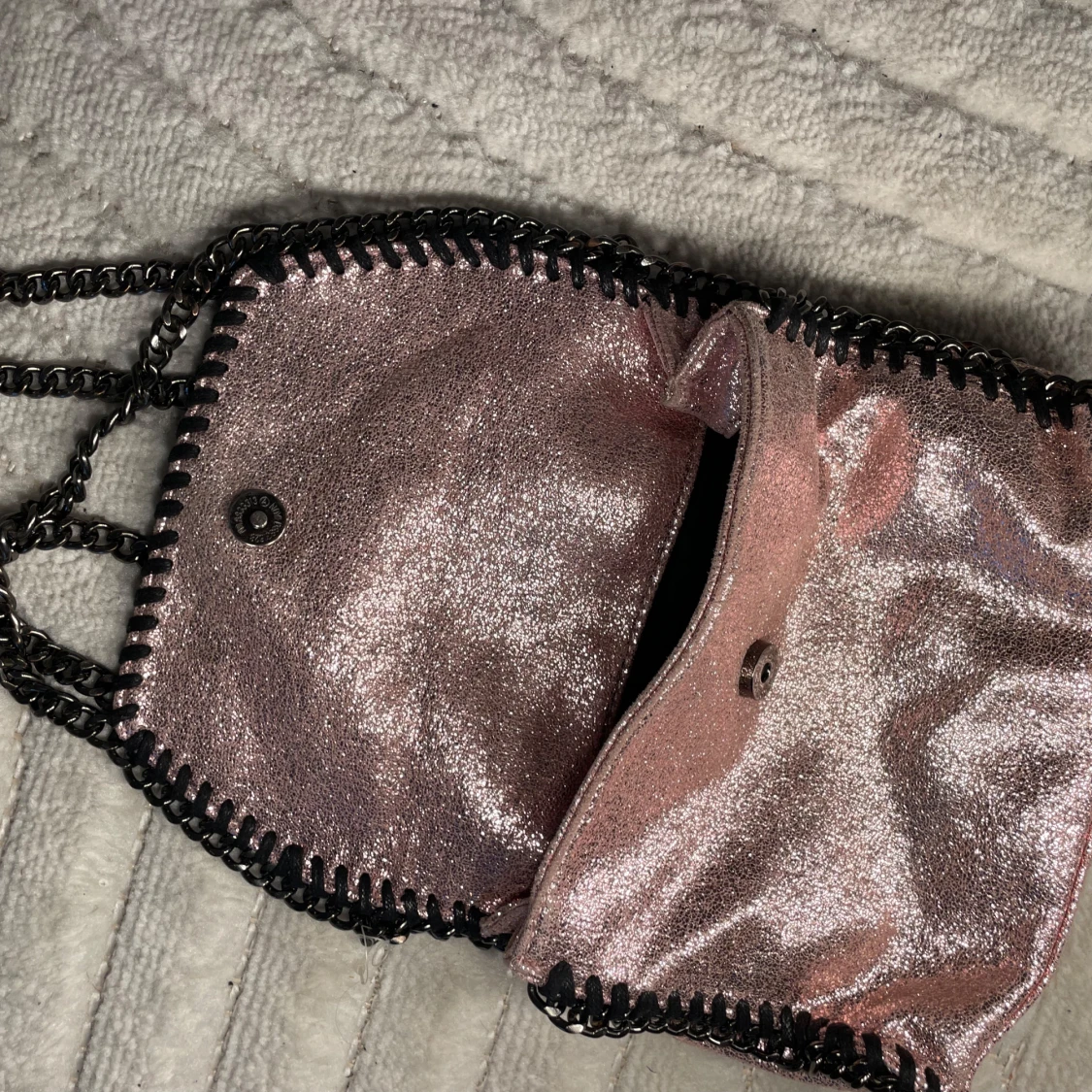 Snygg rosa glittrig axelväska med en cool kedja som axelrem. Väskan har en unik design med svarta detaljer längs kanterna och en praktisk knappstängning. Perfekt för att ge din outfit lite extra bling!