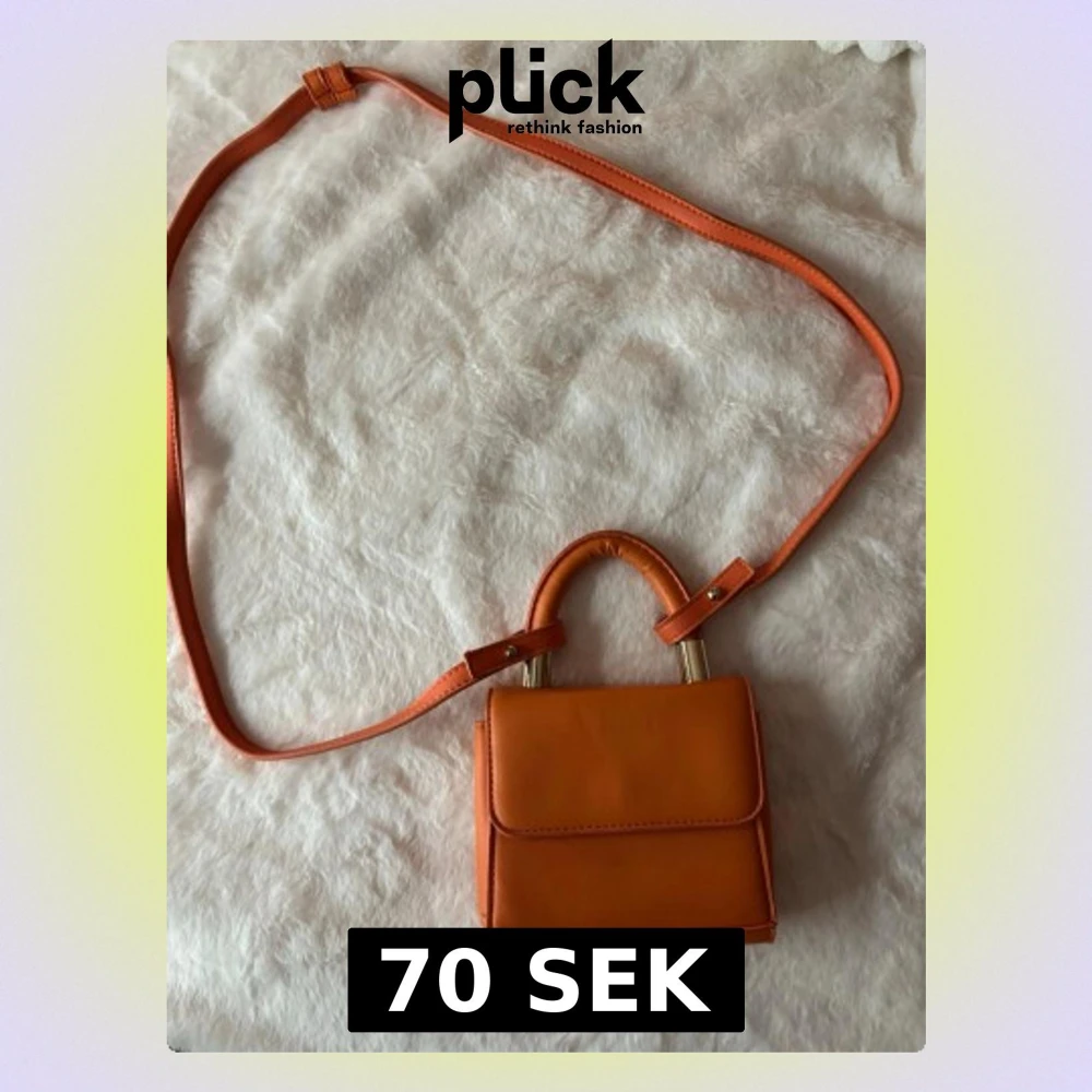 Liten orange axelväska i boxig modell med justerbart axelband och guldiga metalldetaljer vid handtaget. Väskan har magnetlås.