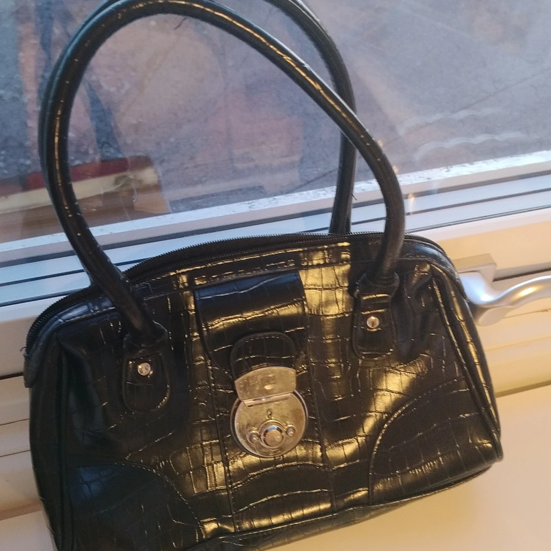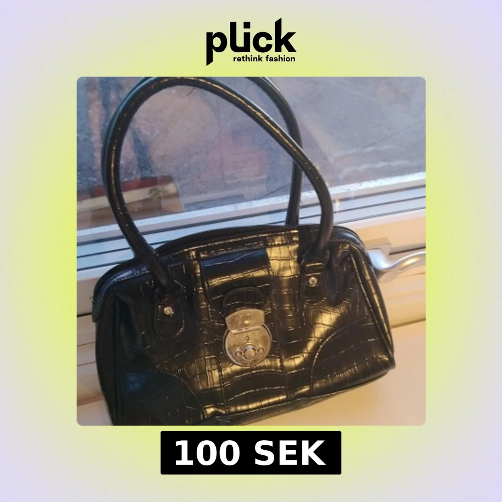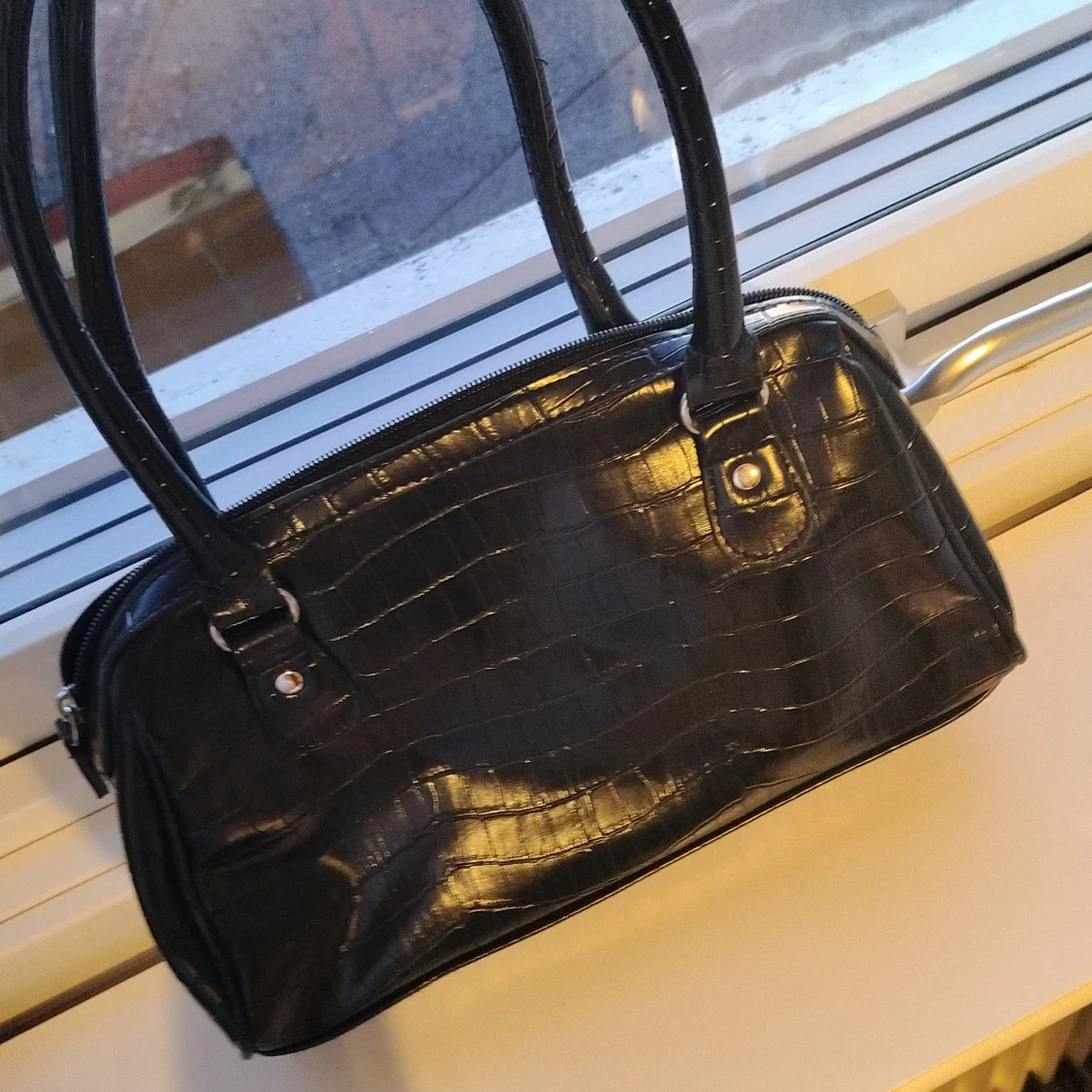 Snygg svart handväska i syntetmaterial med krokodilpräglat mönster. Väskan har två handtag och en dekorativ låsdetalj på framsidan. Perfekt för att ge en elegant touch till din outfit. Nästan aldrig andvänd🩷