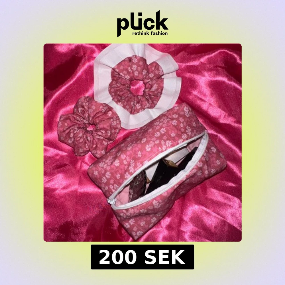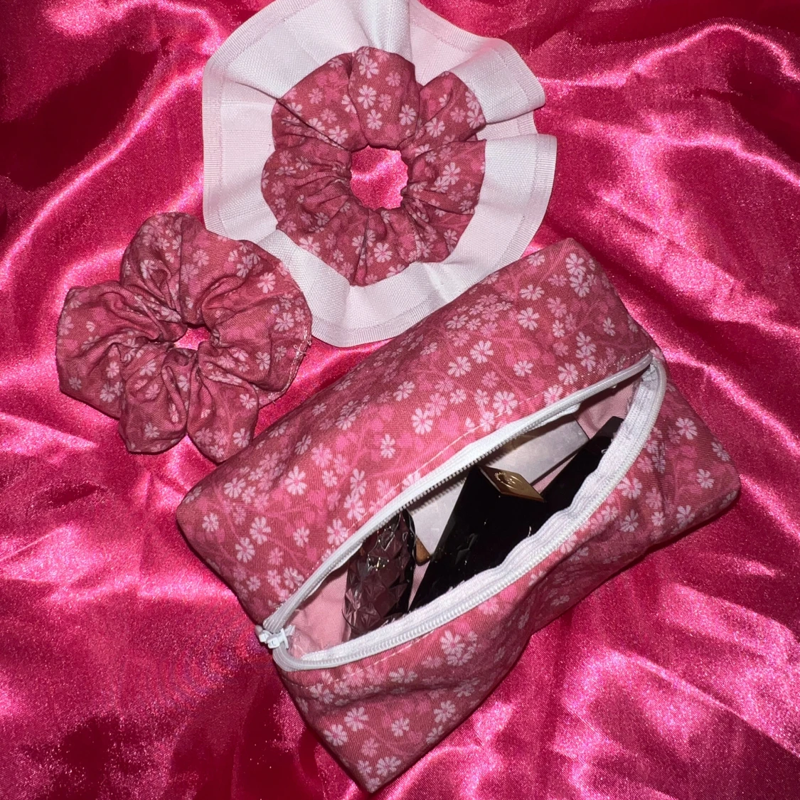 Handgjorda produkter , sminkväska och 2 matchande hårsnoddar ingår i paketet.
