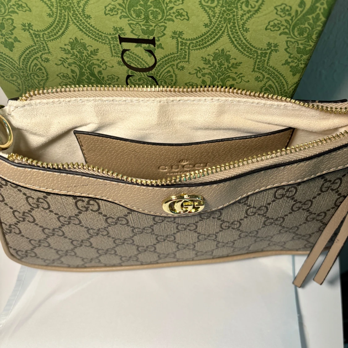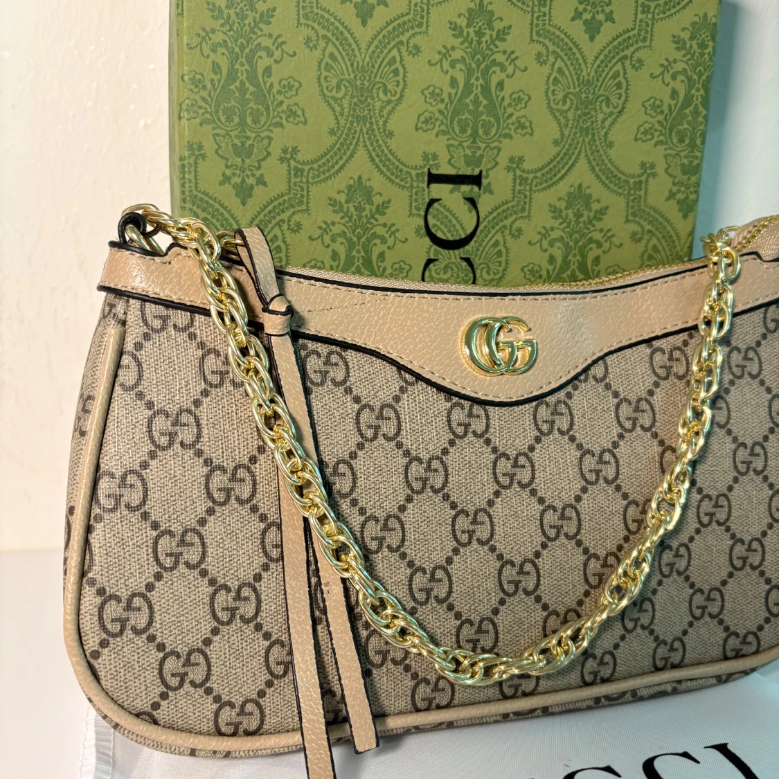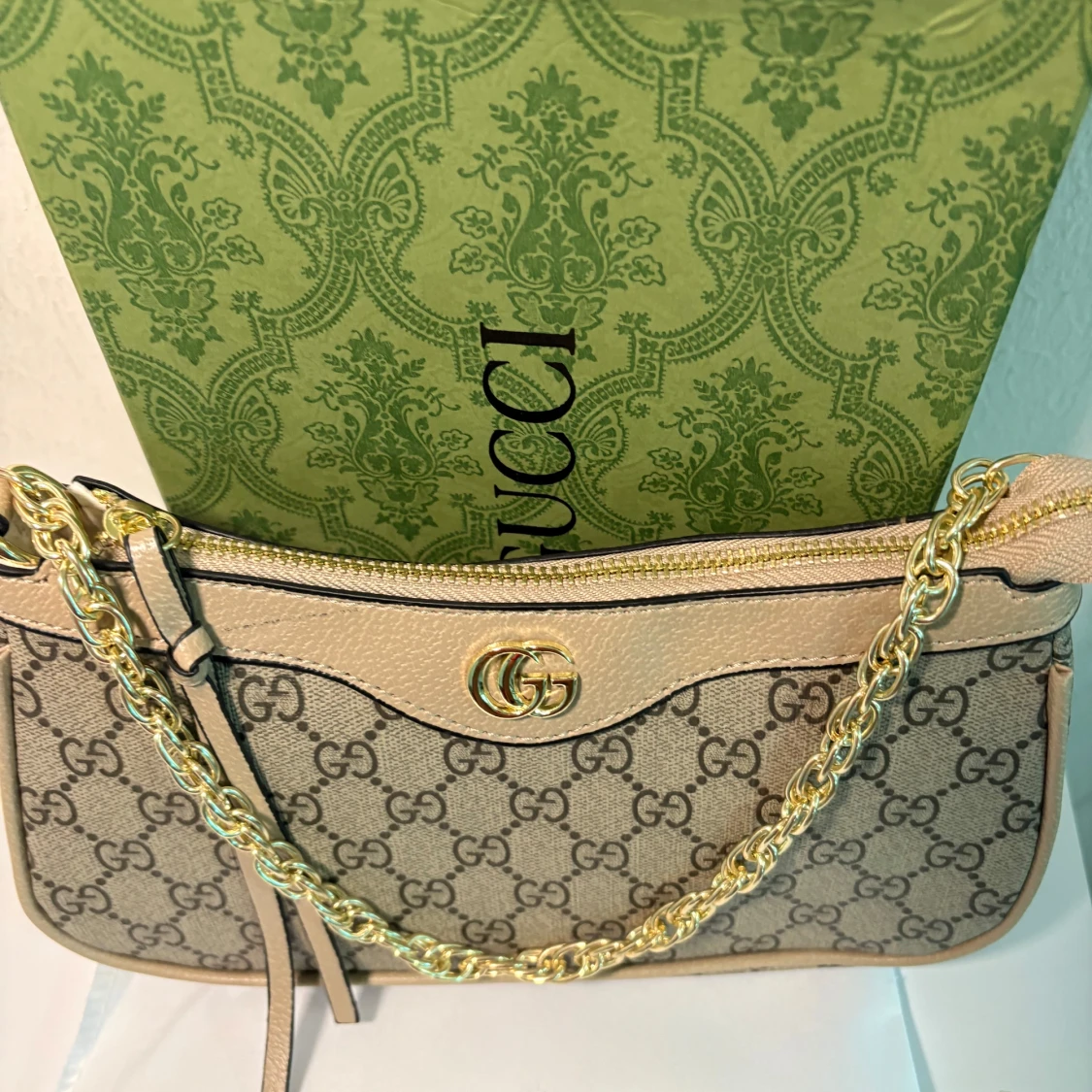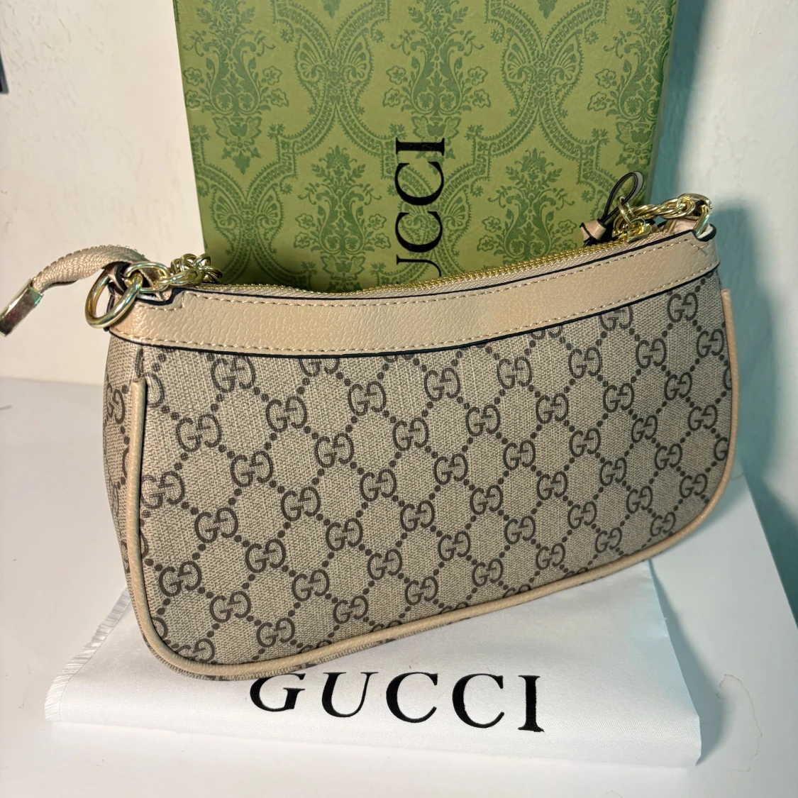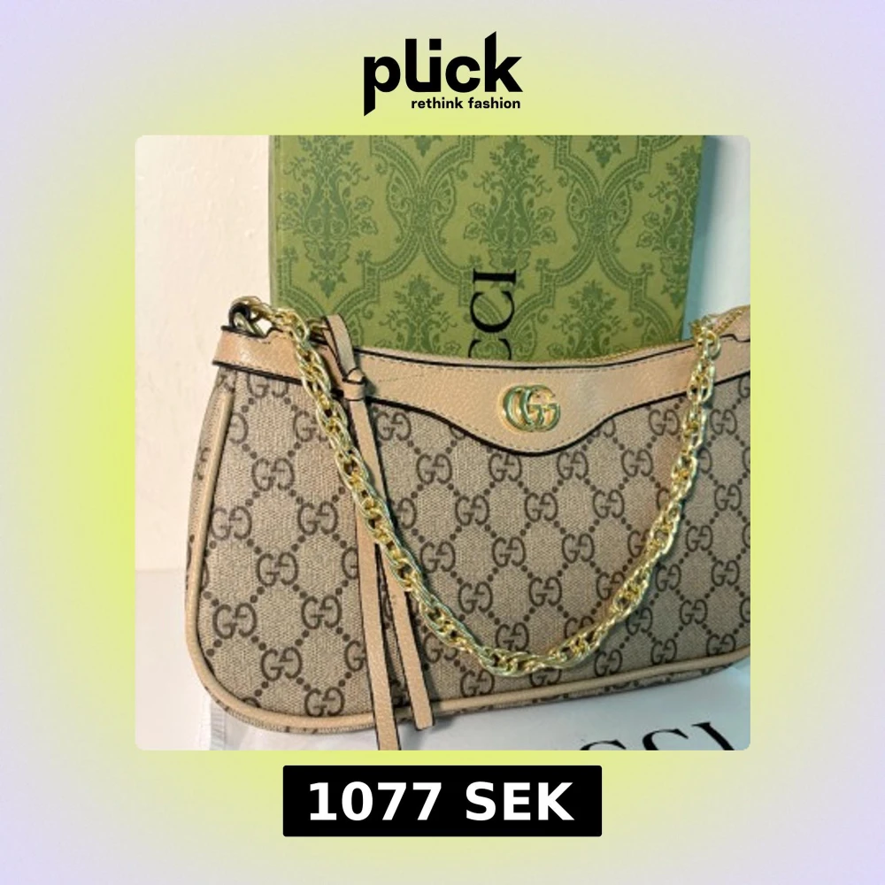 Snygg Ophidia i klassiskt GG Supreme-mönster. Väskan är beige och med detaljer i beige skinn, guldfärgad kedja och dragkedja. Ikonisk GG-logga framtill och innerfack i ljust tyg. Perfekt för dig som vill ha en lyxig och trendig accessoar. Skickas snabbt med kartong och dustbag.