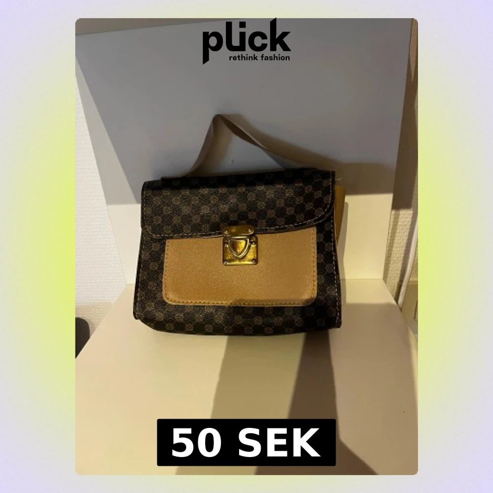 Snygg handväska i brunt och beige med guldigt spänne framtill. Väskan har ett diskret mönster och en stilren, fyrkantig form. Perfekt storlek för det viktigaste och enkel att bära i handtaget. Materialet är syntet med läderkänsla.