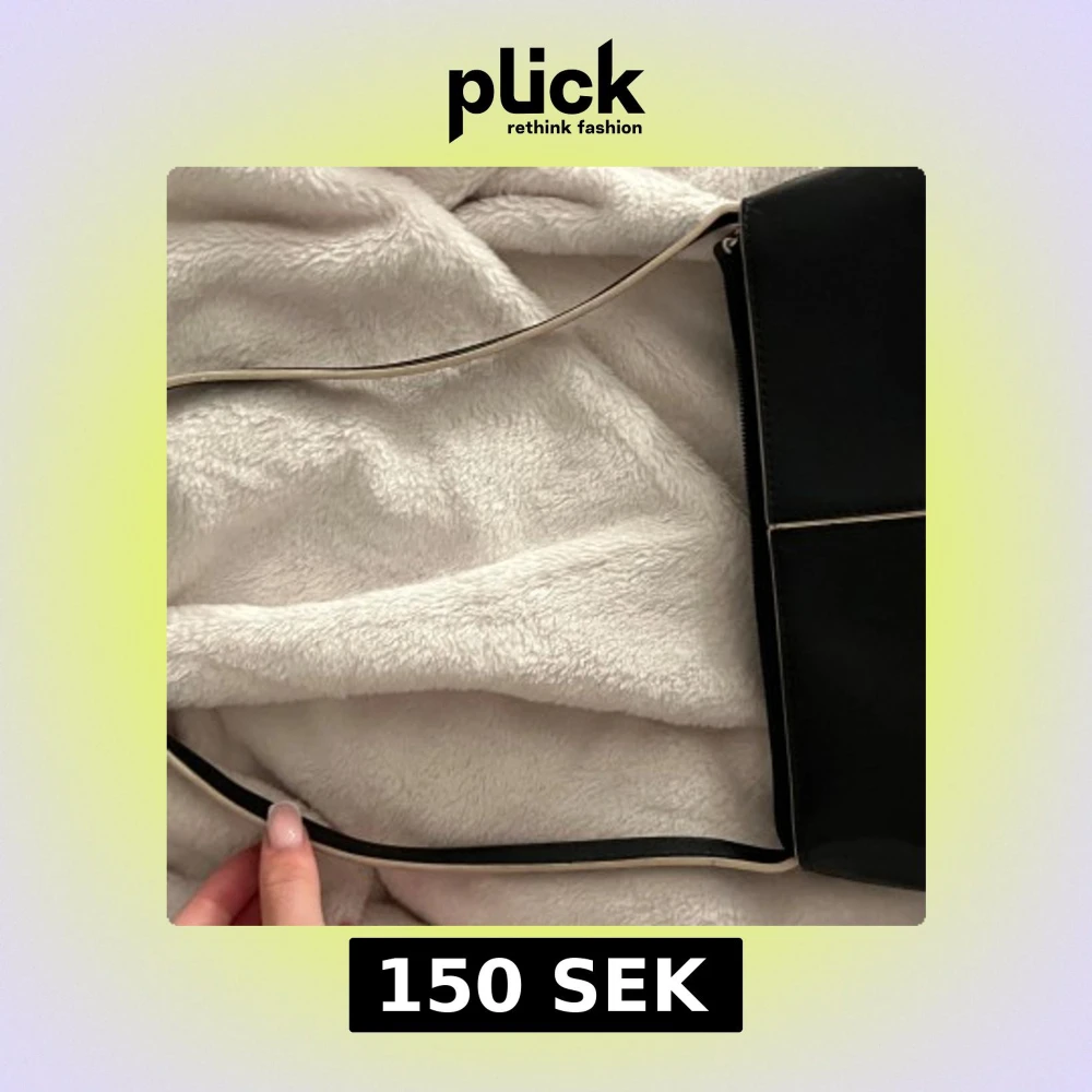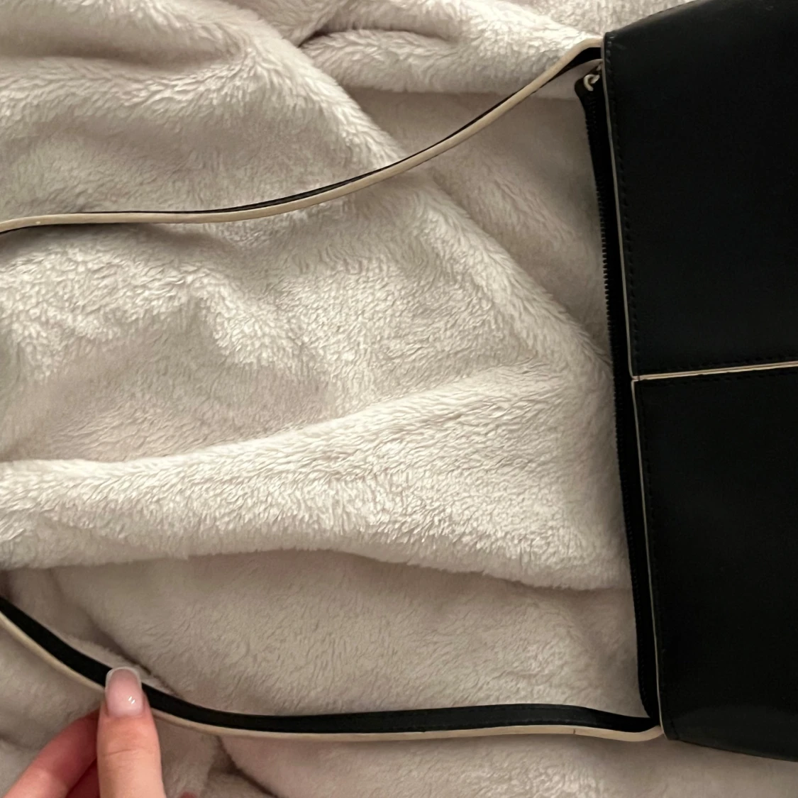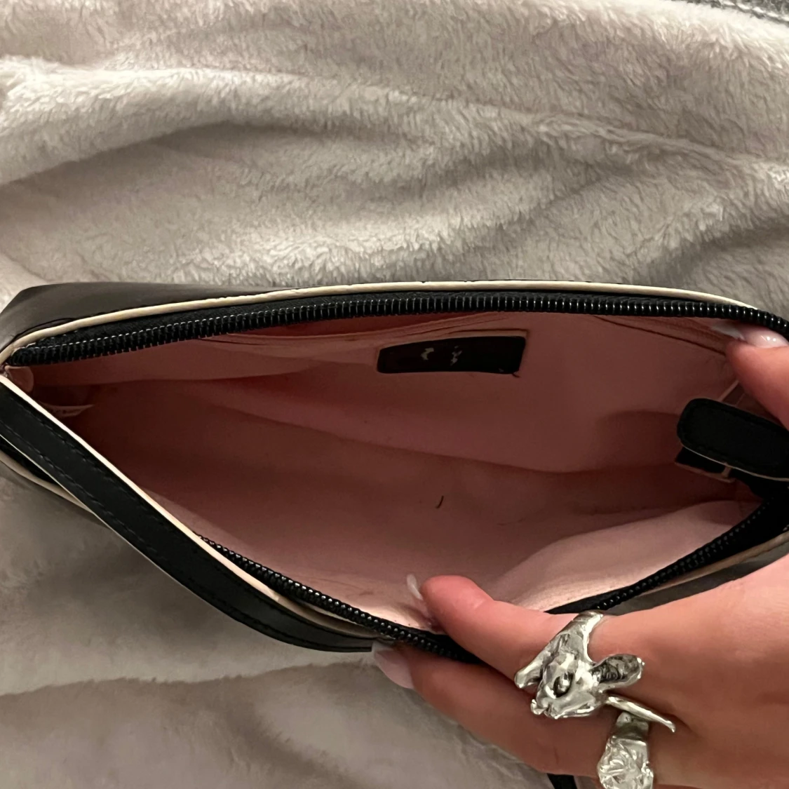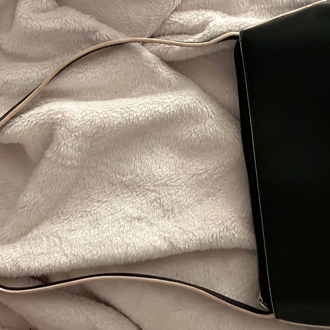 Stilren svart axelväska med raka linjer och kontrasterande ljusa kanter. Väskan har dragkedja upptill och ett ljusrosa innerfoder. Perfekt storlek för det viktigaste och enkel att matcha med olika outfits.
