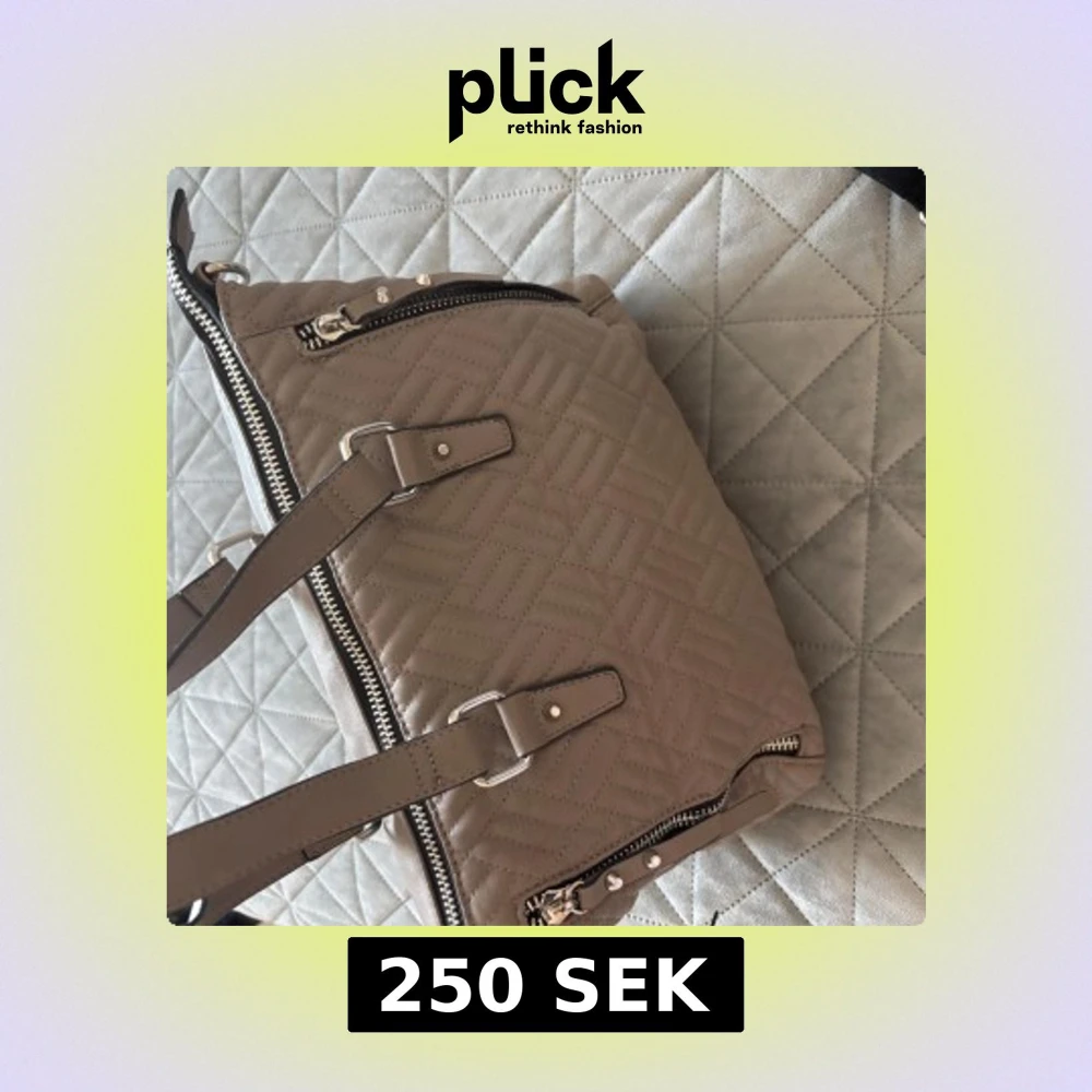 Snygg grå grön väska med quiltat mönster och flera dragkedjor. Väskan har både handtag och en justerbar axelrem i svart och beige. Perfekt för att bära med sig det viktigaste med stil.