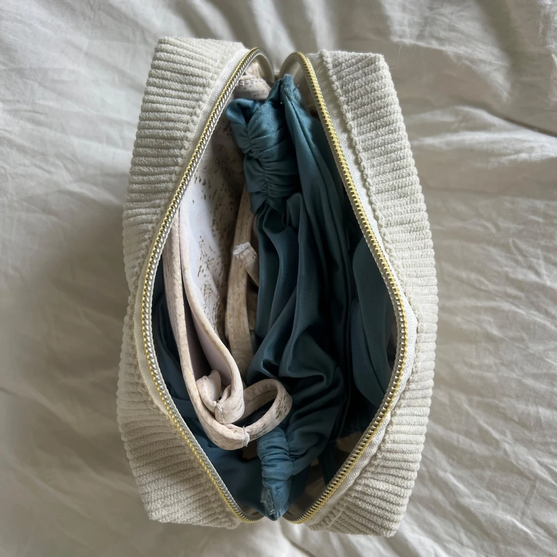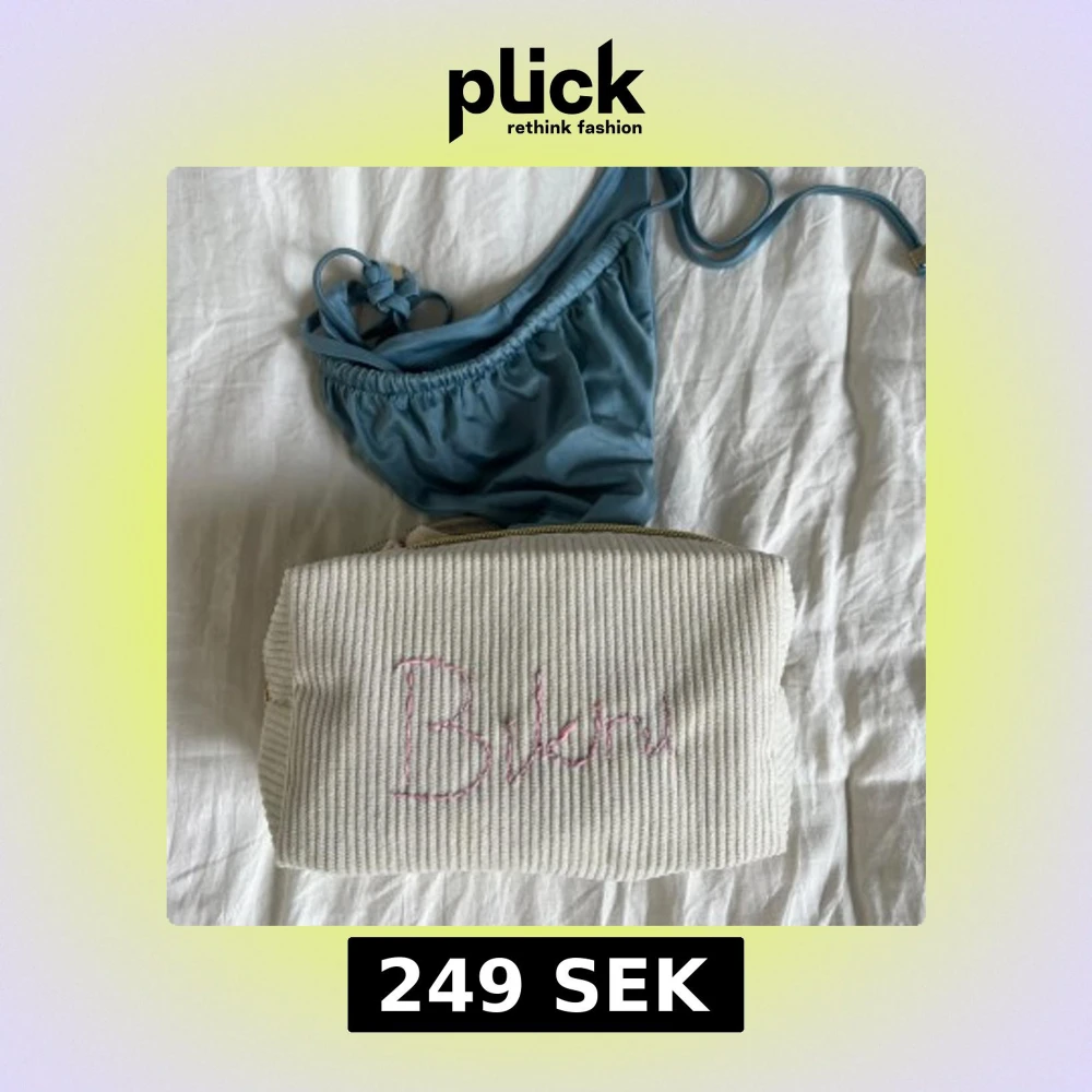En vit ribbad förvaringspåse med texten 'Bikini' (går även att be om annan personlig broderad text) broderad i rosa. Smidig att ta med på resan! Storlek: 17x10x6cm