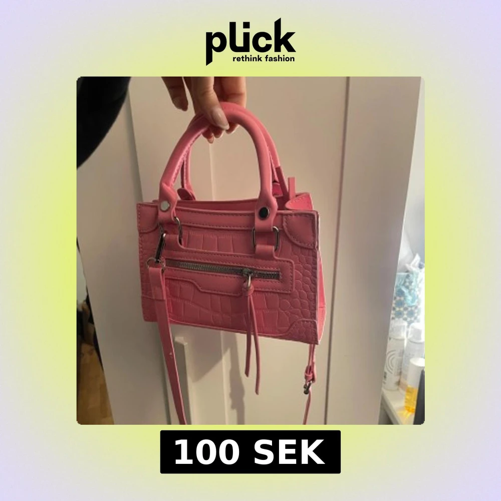 Säljer en liten rosa handväska i croco-mönstrad syntet med både handtag och axelrem. Väskan har silverfärgade metalldetaljer och en dragkedja framtill med dekorativa remmar. Perfekt för dig som vill ha en färgklick till outfiten.