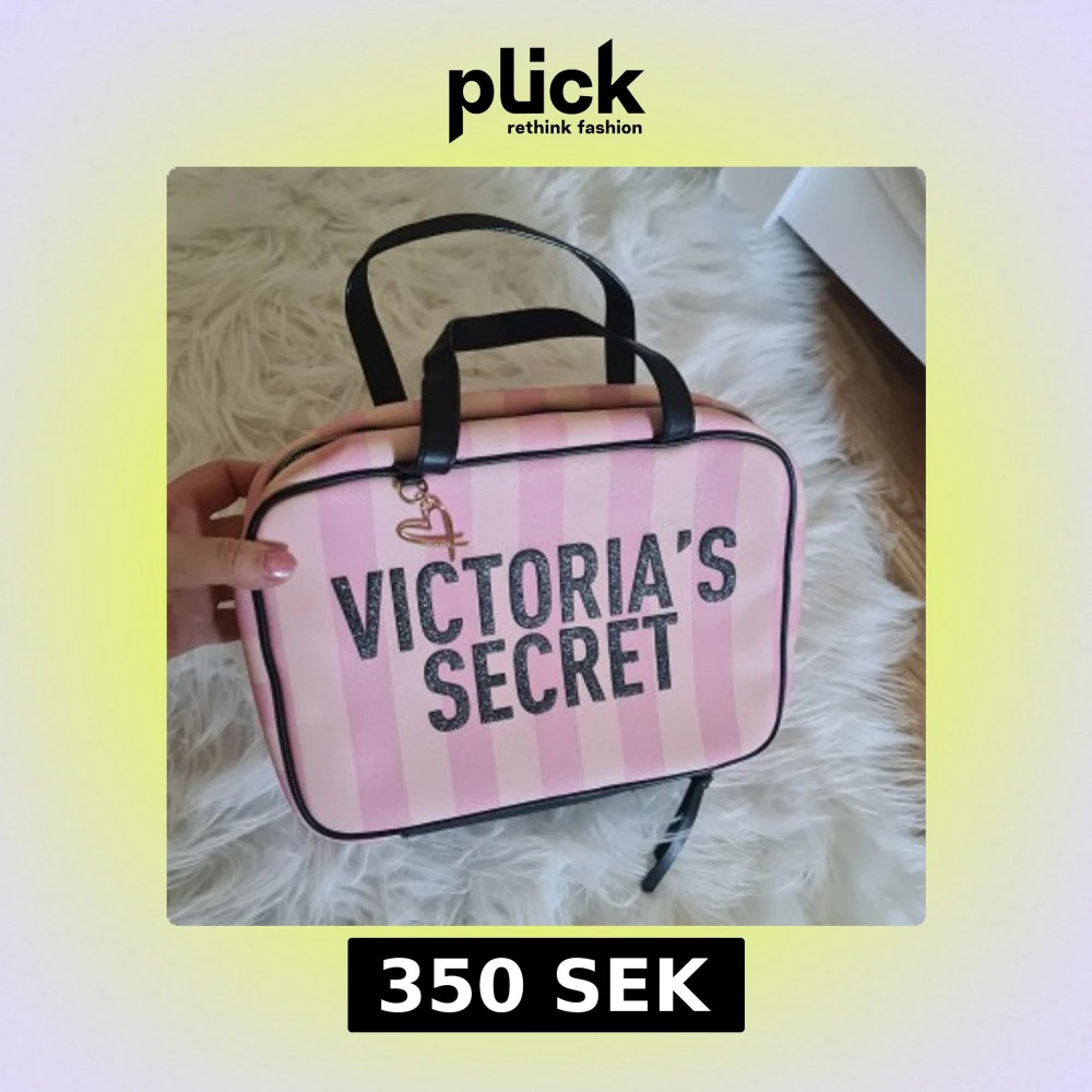 Superfin rosa necessär med klassiska ränder och svart text från Victoria's Secret. Väskan har svarta handtag, dragkedja och flera genomskinliga fack inuti samt en krok för upphängning. Perfekt för att organisera smink eller hudvård. En äldre modell som inte säljs längre och den är verkligen I super fint skick, helt utan anmärkningar!! Har använt den jätte försiktigt och endast på resor. Den är I princip som ny. Går inte ner i pris så kommer ej svara på bud. Victoria secret