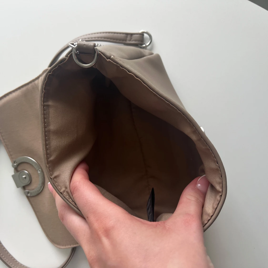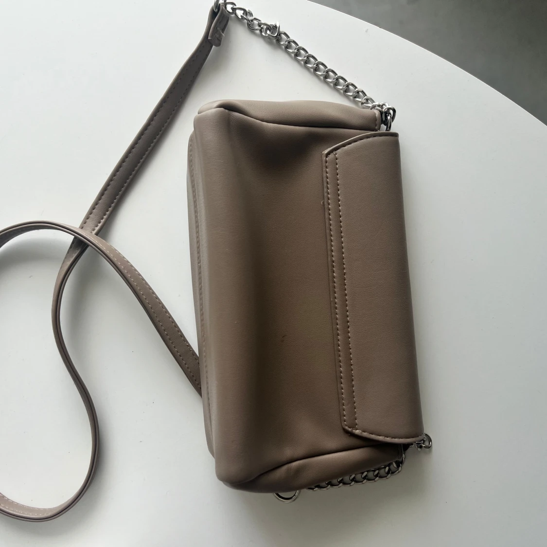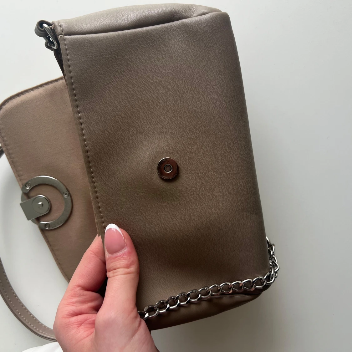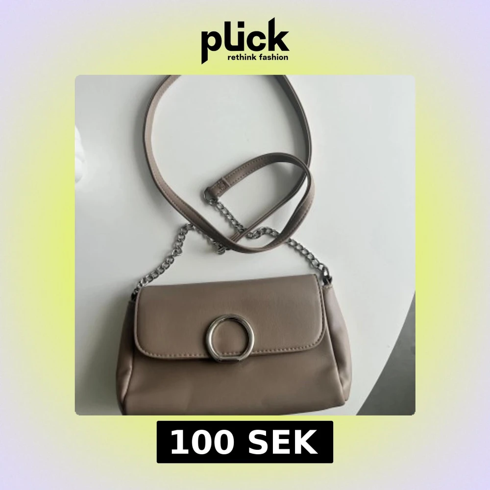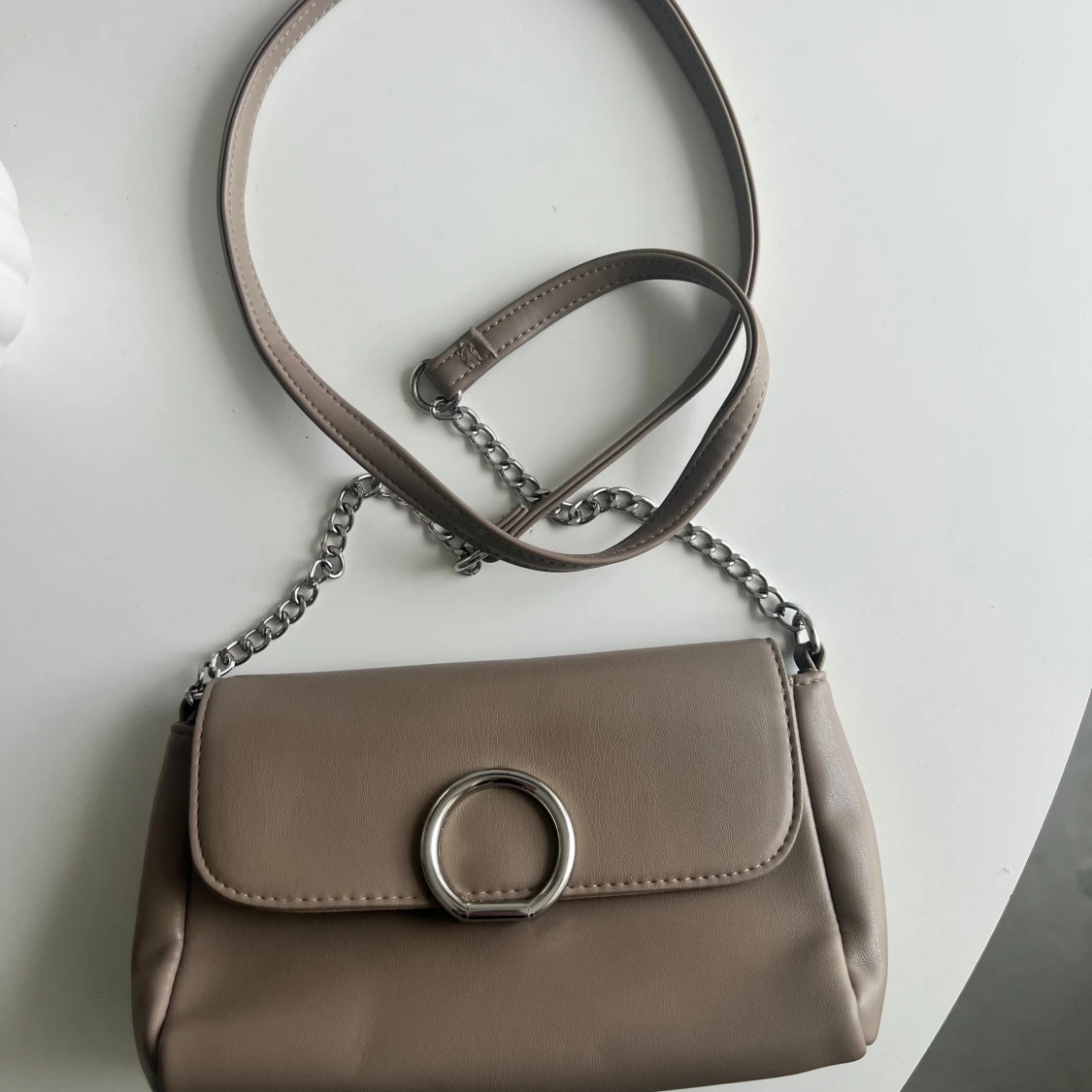 Säljer en stilren beige axelväska med silverfärgad kedja och rund metallring på locket. Perfekt storlek för det viktigaste och passar till många olika outfits.
